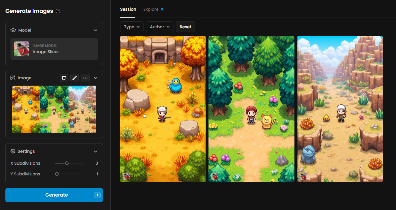 This example shows how the model isolates multiple scene panels from a wide composite image. By slicing the source into equal vertical sections, each environment is extracted as an independent artwork. This workflow is useful for separating level concepts, background variations or storyboard-style scene layouts.