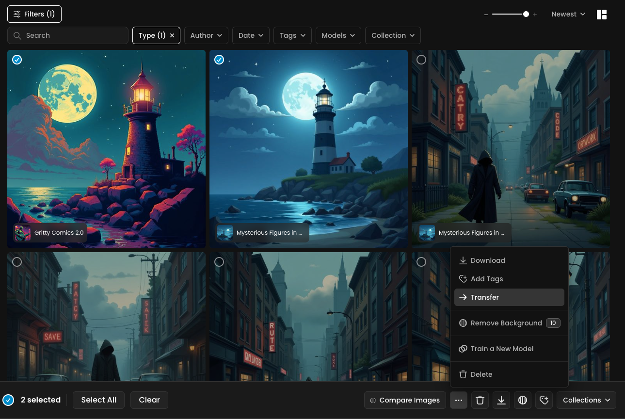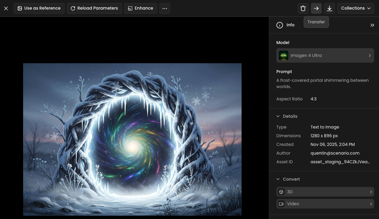 Transferring assets between projects in Scenario allows you to efficiently manage and reorganize your content across different workspaces. This feature is particularly useful when you need to move assets from a personal project to another project, or when you are restructuring your work and need to consolidate assets. While the transferred assets cannot be replayed in the new project, the main elements of the generation are kept, ensuring that your creative work is preserved.