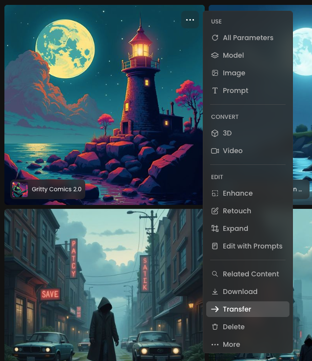 Reload Parameters: Transferred assets cannot be re-generated in the new project. However, the main elements of the generation, such as the prompt and other metadata, are preserved. Model info will be available if the model used to generate is Public.