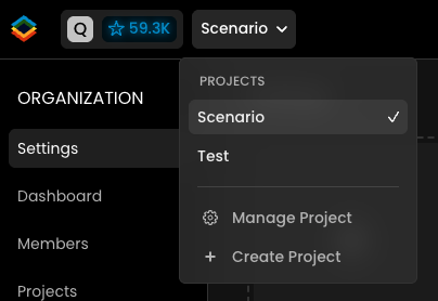 Find the Organization icon in the upper left corner of the Scenario interface (it displays your organization's initials). Next to it you have your Project dropdown. Hover over it and select 'Manage Project' from the dropdown menu.