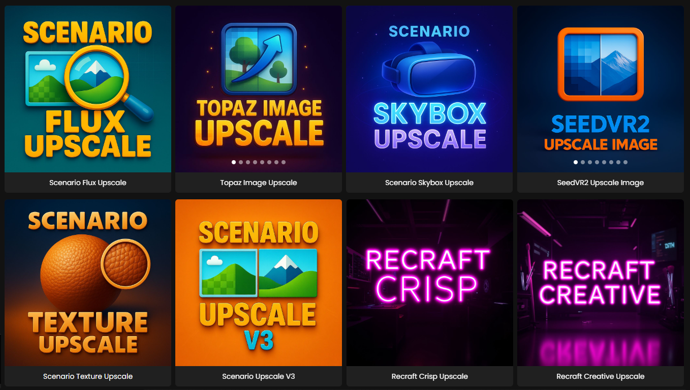 Scenario Skybox Upscale – tailored for panoramic or 360° backgrounds, maintaining consistency across wide scenes.