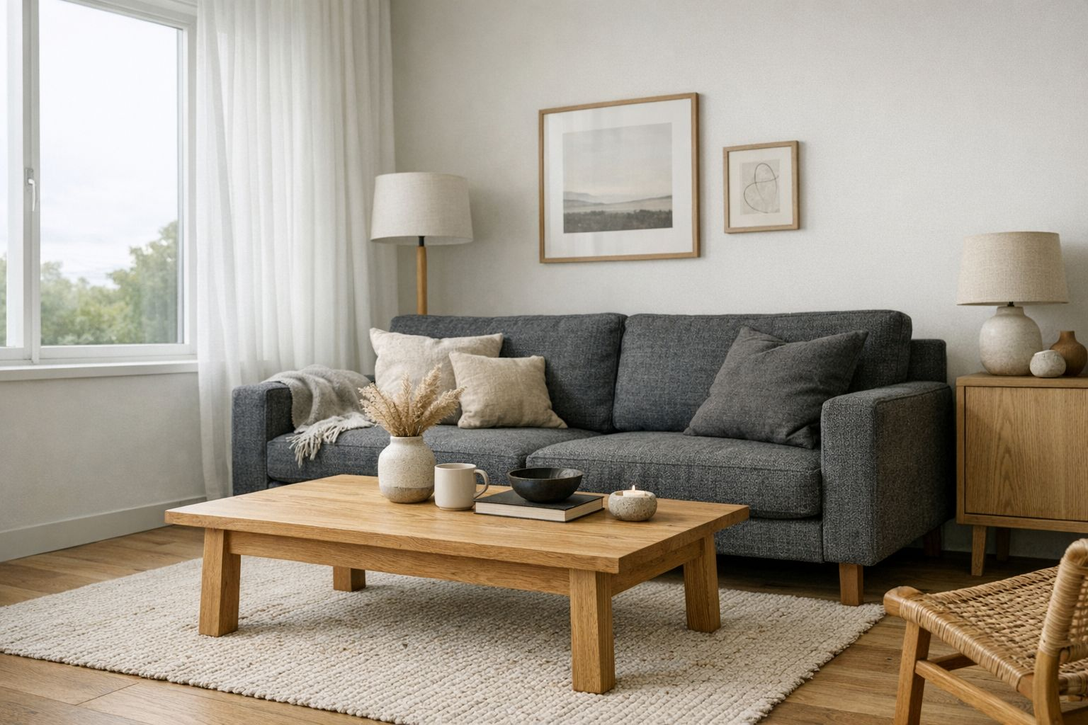 Prompt: A high-resolution architectural interior shot of a Scandinavian-style living room. Features a charcoal grey fabric sofa, a light oak coffee table, and a large window with sheer white curtains. Soft, overcast natural light. Avoid 'plastic' surfaces; ensure fabrics have visible weaving and wood has realistic grain. 35mm wide-angle lens.