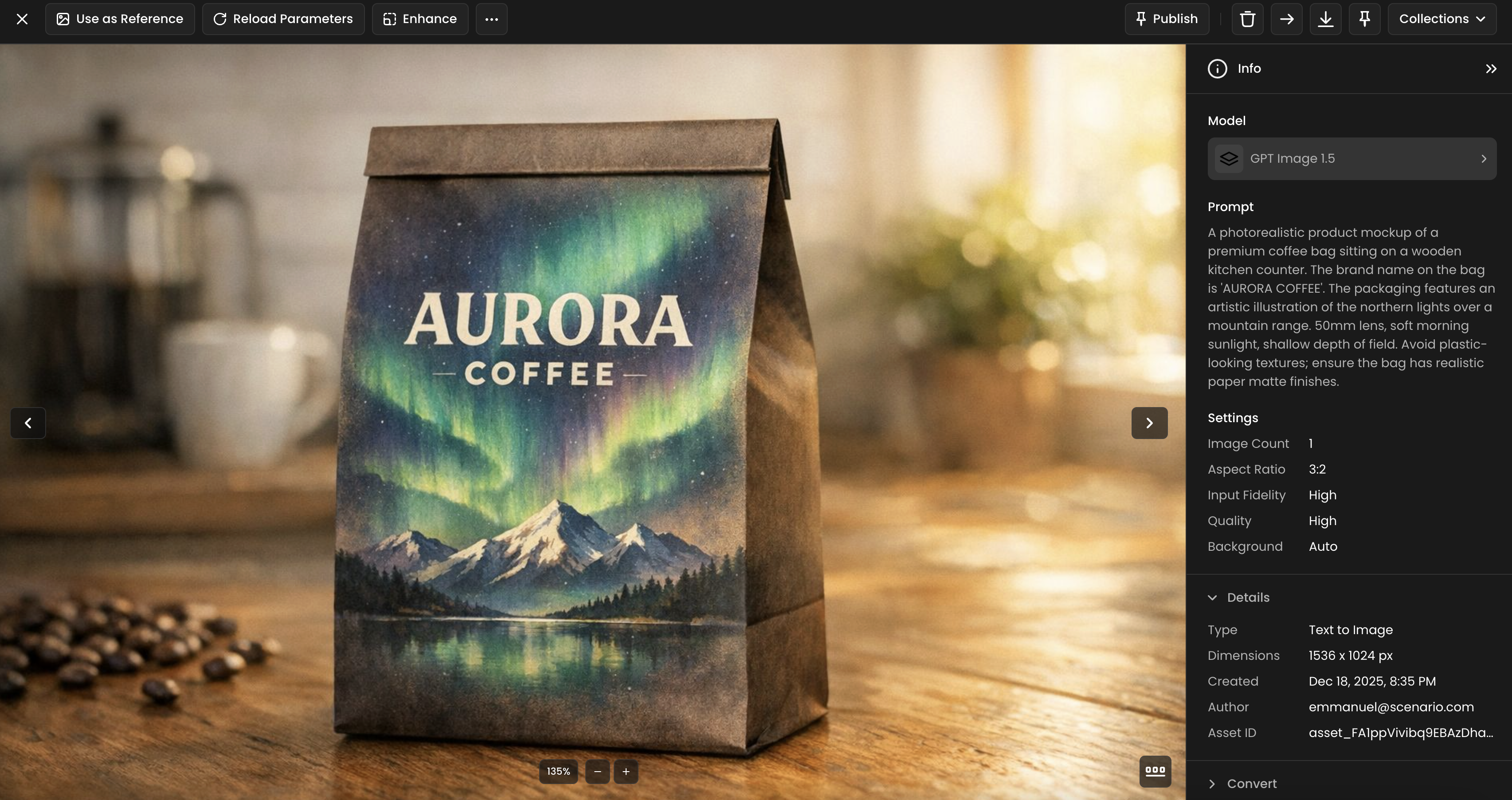 Prompt: A photorealistic product mockup of a premium coffee bag sitting on a wooden kitchen counter. The brand name on the bag is 'AURORA COFFEE'. The packaging features an artistic illustration of the northern lights over a mountain range. 50mm lens, soft morning sunlight, shallow depth of field. Avoid plastic-looking textures; ensure the bag has realistic paper matte finishes.
