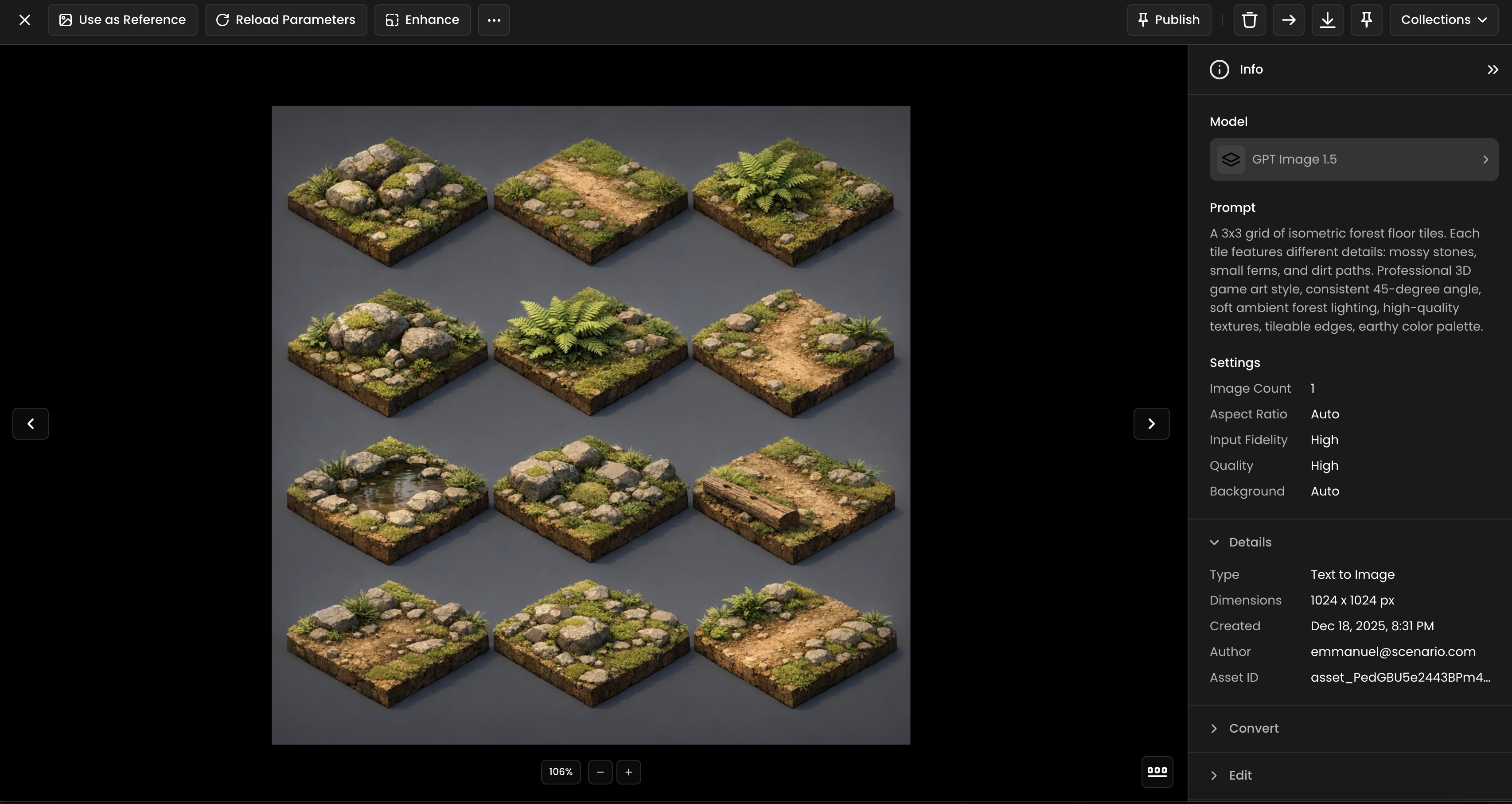 Prompt: "A 3x3 grid of isometric forest floor tiles. Each tile features different details: mossy stones, small ferns, and dirt paths. Professional 3D game art style, consistent 45-degree angle, soft ambient forest lighting, high-quality textures, tileable edges, earthy color palette.