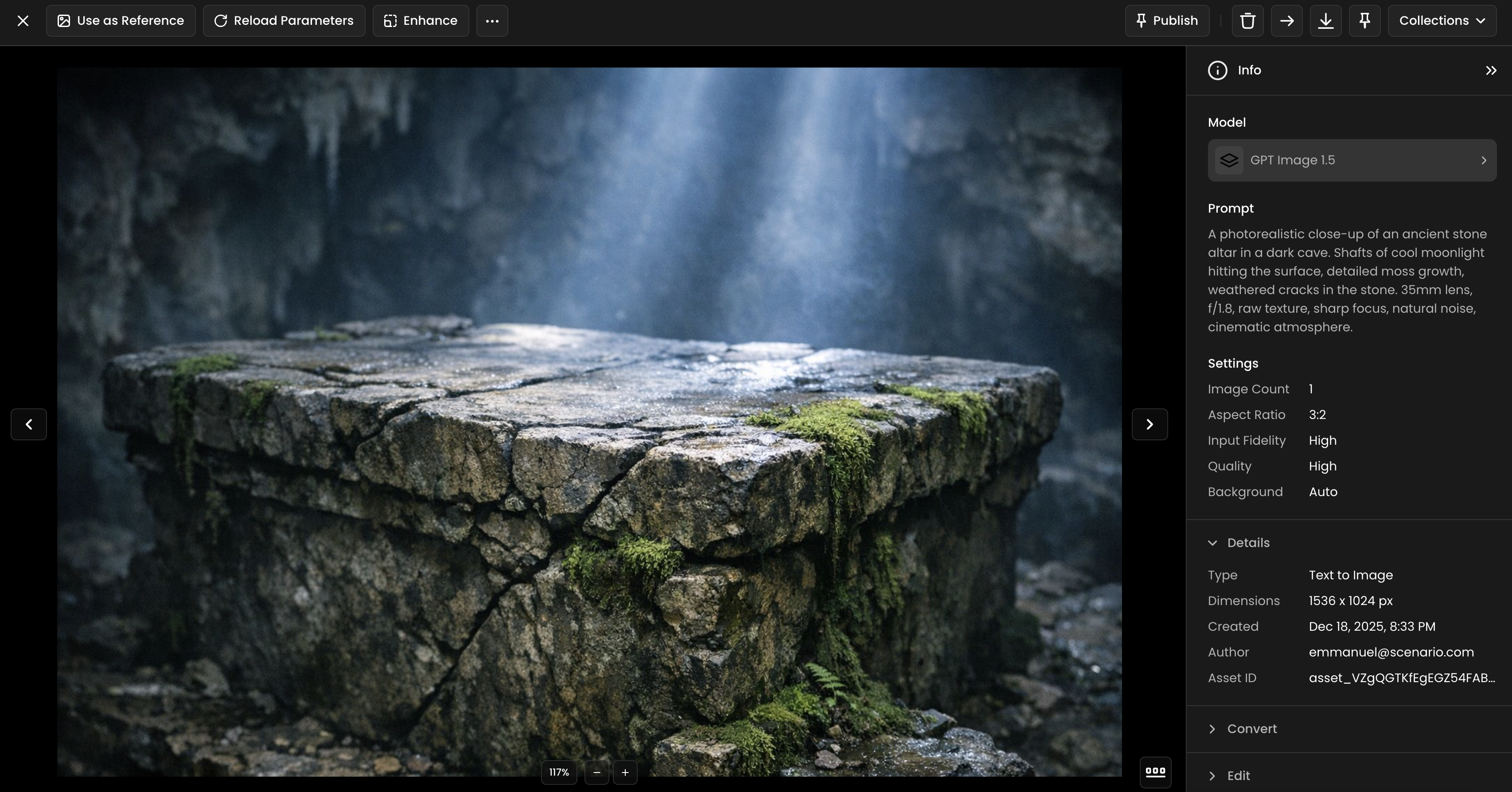 Prompt: "A photorealistic close-up of an ancient stone altar in a dark cave. Shafts of cool moonlight hitting the surface, detailed moss growth, weathered cracks in the stone. 35mm lens, f/1.8, raw texture, sharp focus, natural noise, cinematic atmosphere."