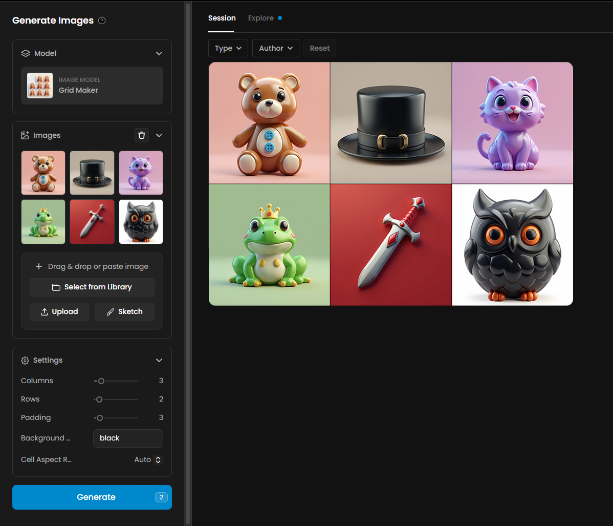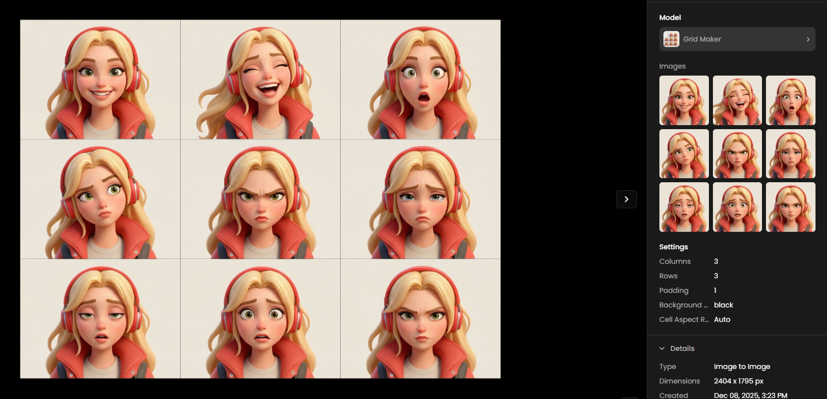 Grid Maker is a visual organisation tool in Scenario that assembles a selection of images into a neatly aligned grid. Rather than arranging pictures by hand, this tool lets you pick the exact number of rows and columns for your layout so you can present variations, poses or concept iterations in a single view. Similar collage tools provide full control over the number of rows and columns and aspect ratio, letting you build a grid that suits your design without starting from a preset. You can also customise the spacing and background colour between cells so the final board looks polished.