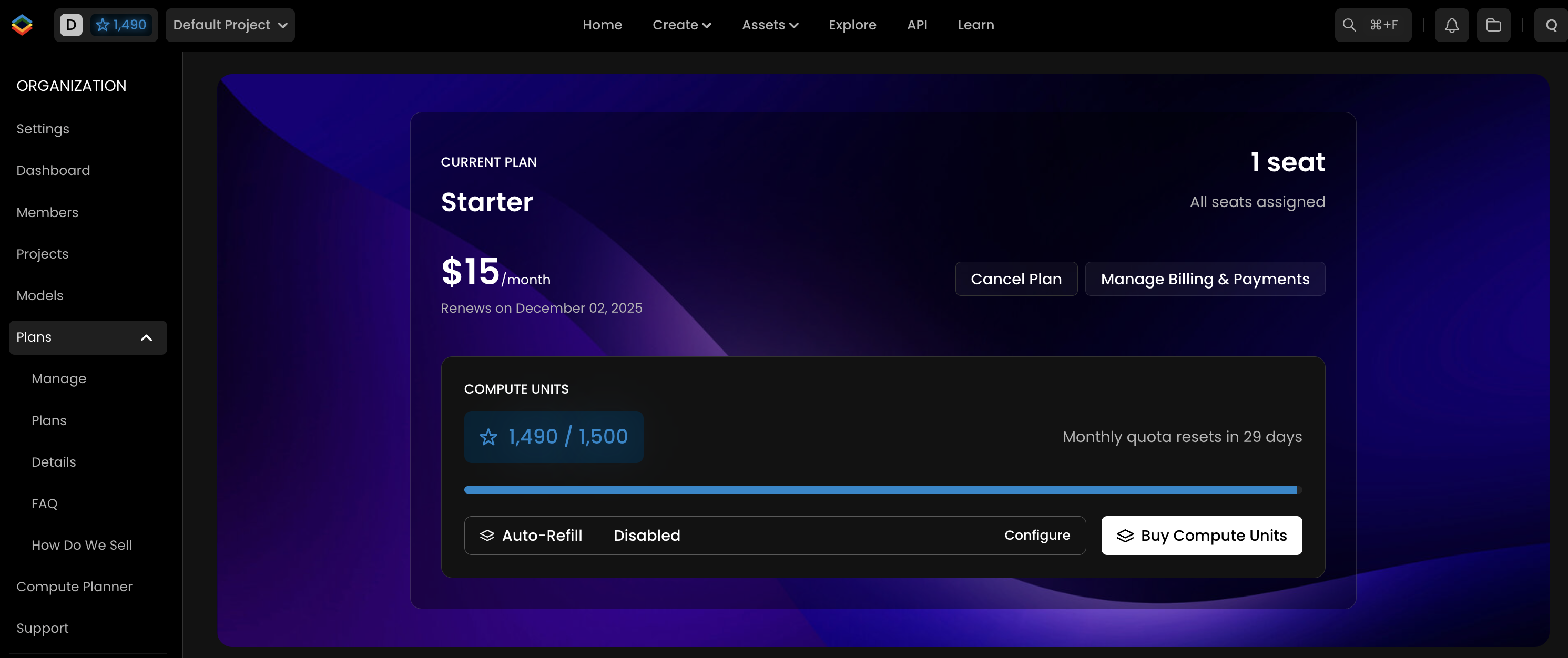 Select the plan that best meets your needs. If you require more seats, additional Compute Units, or higher processing and support priority, choose an upgrade to a higher-tier plan. If you no longer need all the features of your current plan or wish to reduce costs, select a lower-tier plan that still covers your essential requirements. For a detailed breakdown of features, you can refer to the Pricing & Plans page.