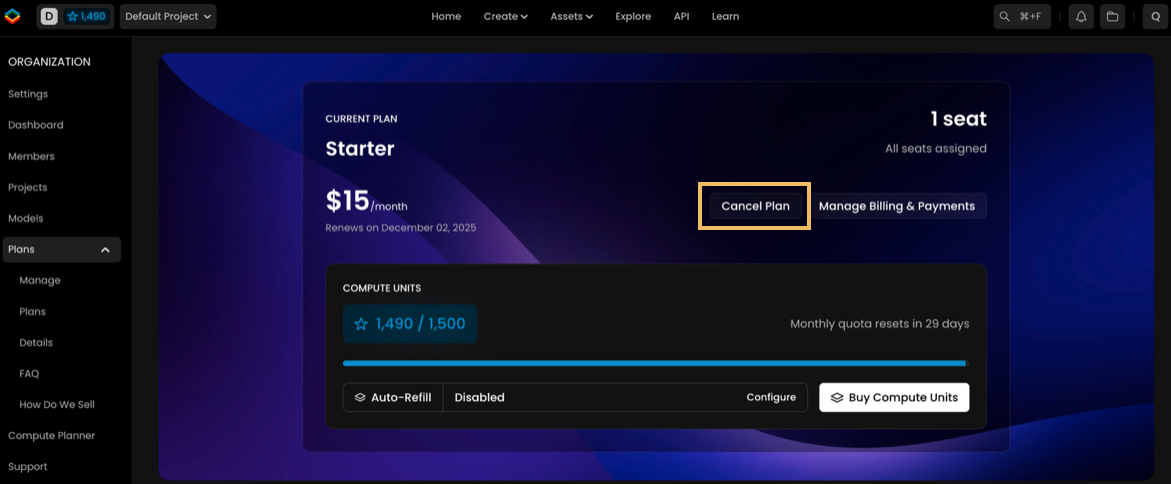 To cancel your subscription, go to Settings → Plans within your Scenario account. Then, clicks on Cancel Plan.