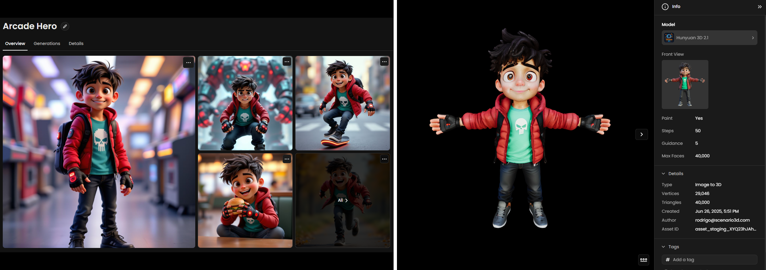Generated 3D models integrate with Scenario's content management system. Use Collections to organize your 3D assets alongside their source images, and apply Tags for easy retrieval in larger projects.