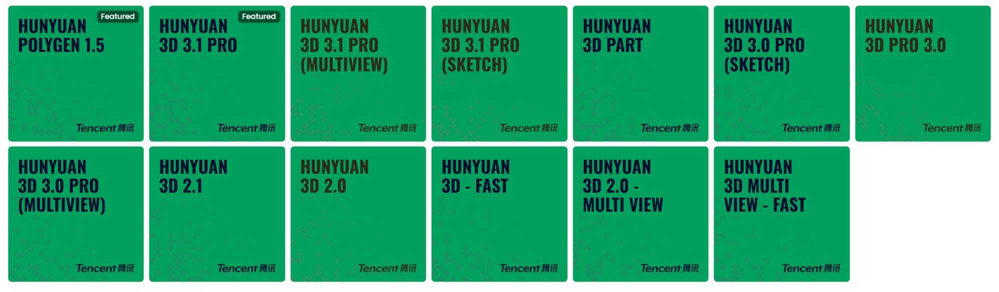 Hunyuan 3D 2.1 / 2.0: Legacy image-to-3D models. These remain available for projects requiring backward compatibility or specific stylistic outputs characteristic of Tencent’s earlier generation algorithms.