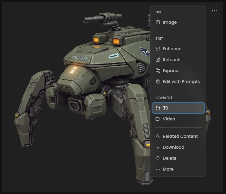 From existing images: Open any image in your Scenario gallery, click the three-dot menu, and select "Convert to 3D"