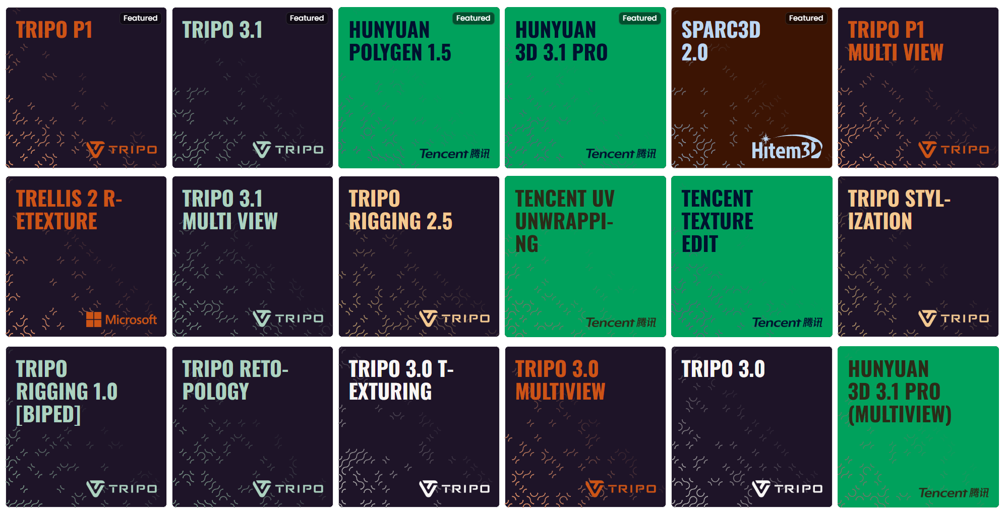 Tripo 3.0 (Standard, MultiView, Texturing). The previous-generation Tripo model, still available in three variants:
