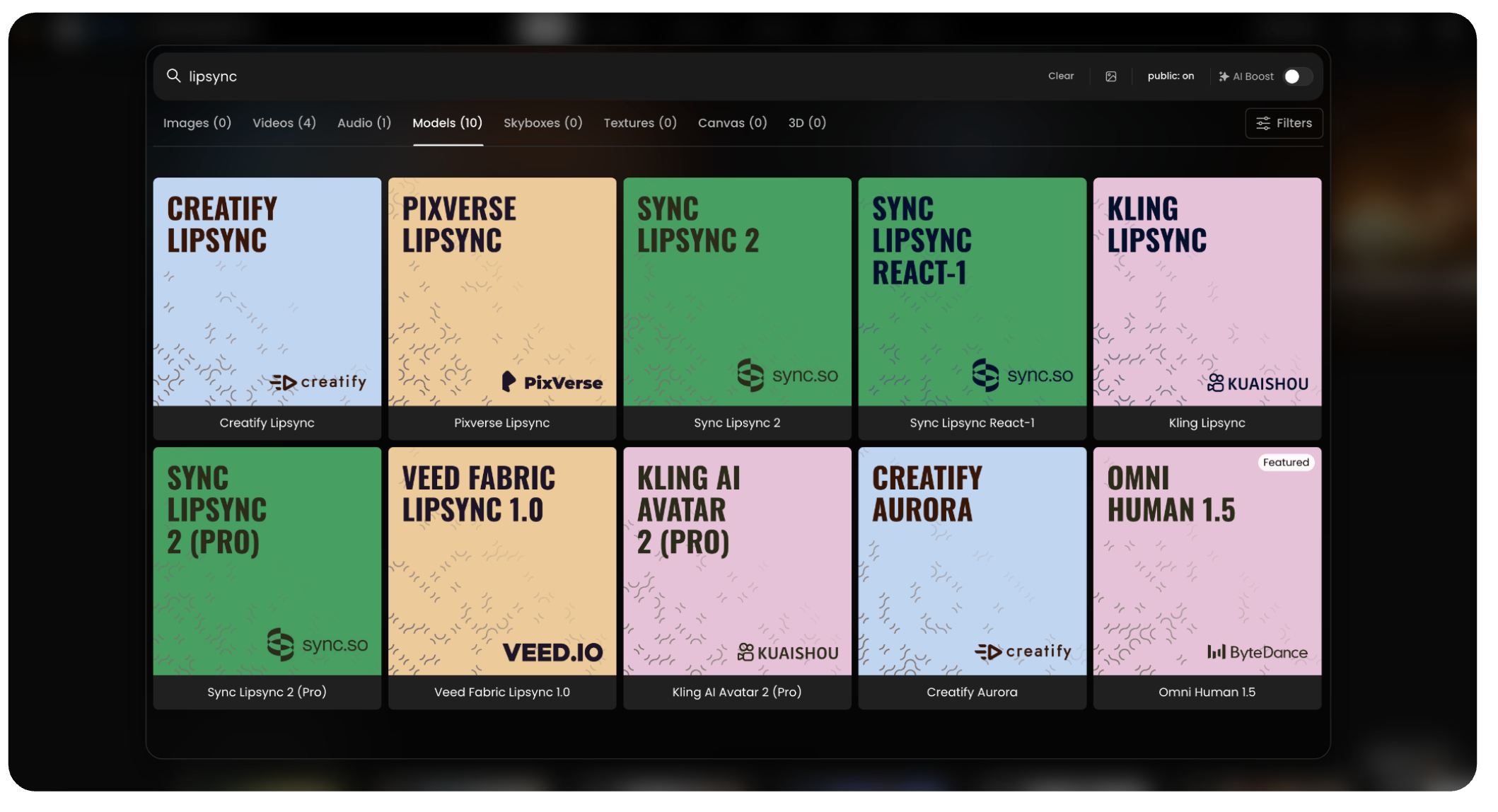 And finally, lip sync animation, found in the “Video generation” tools. Just open the main Video generation interface, and select from the dedicated Lip Sync models to get started.