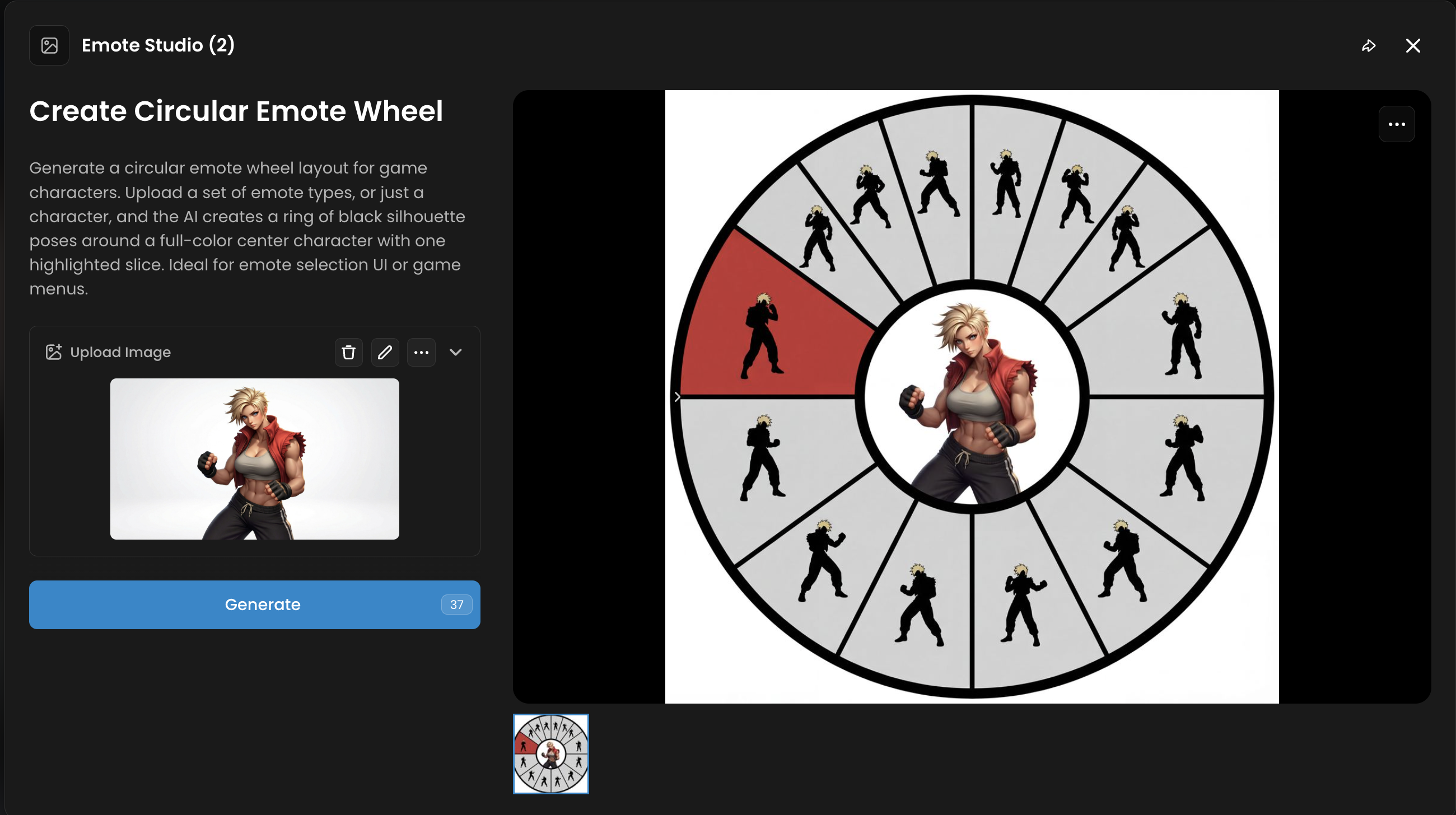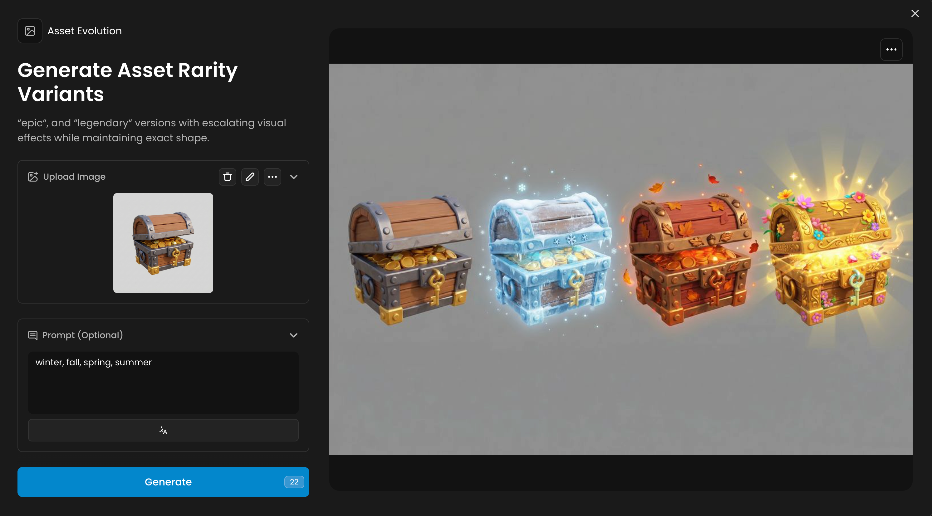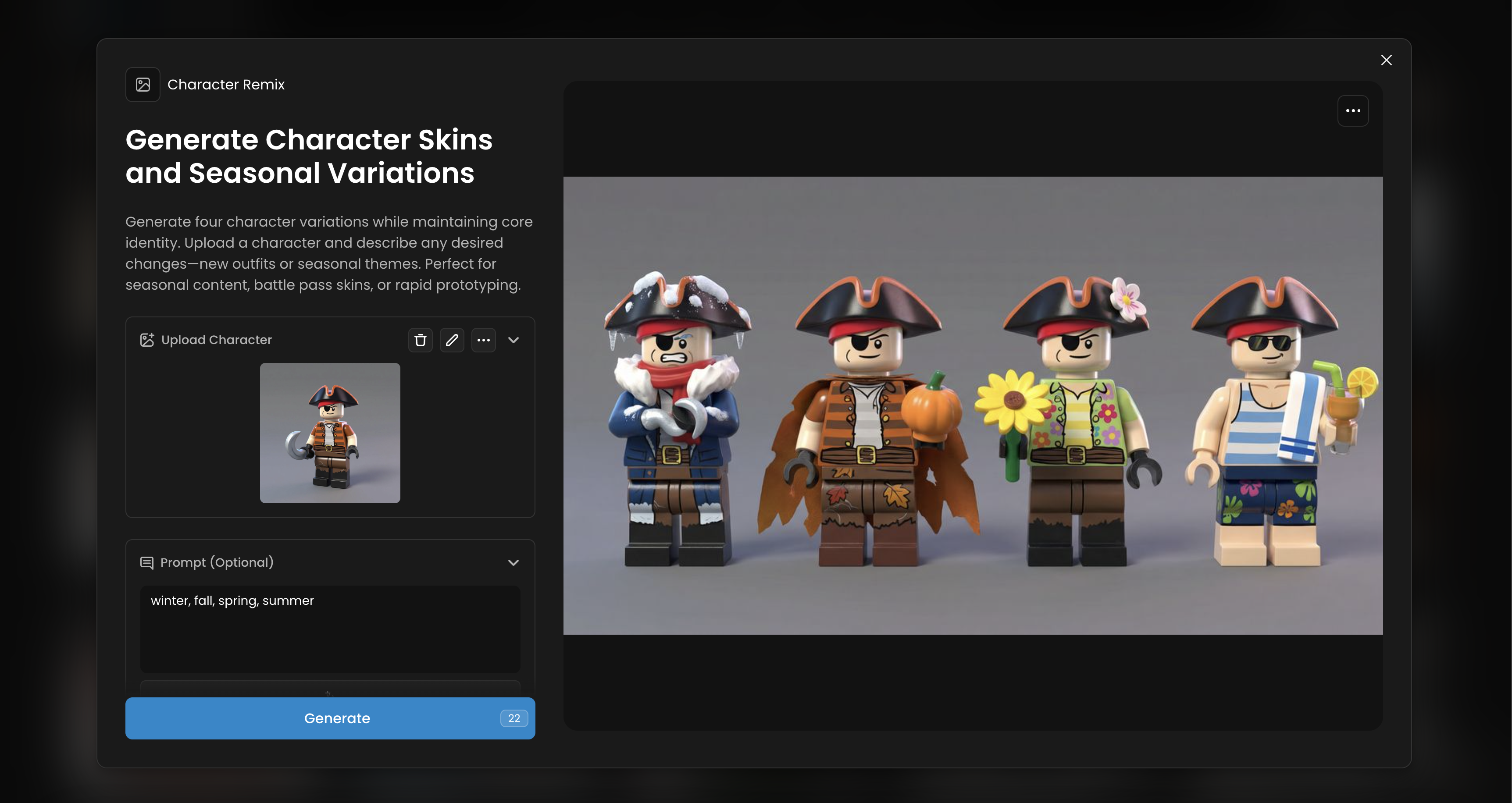 Generate four character variations while maintaining core identity. Upload a character and describe any desired changes—new outfits or seasonal themes. Perfect for seasonal content, battle pass skins, or rapid prototyping.