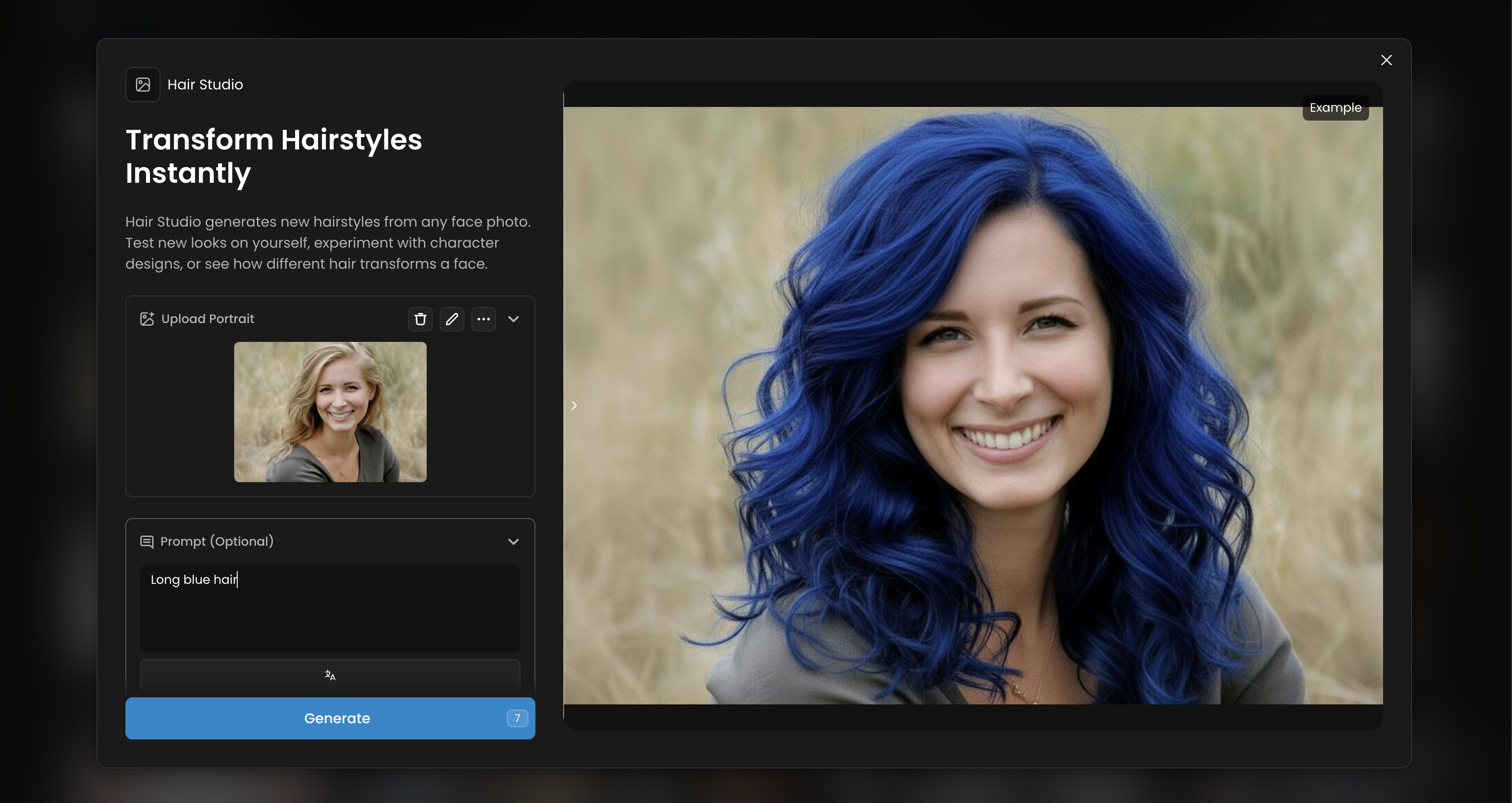 Hair Studio generates new hairstyles from any face photo. Test new looks on yourself, experiment with character designs, or see how different hair transforms a face.