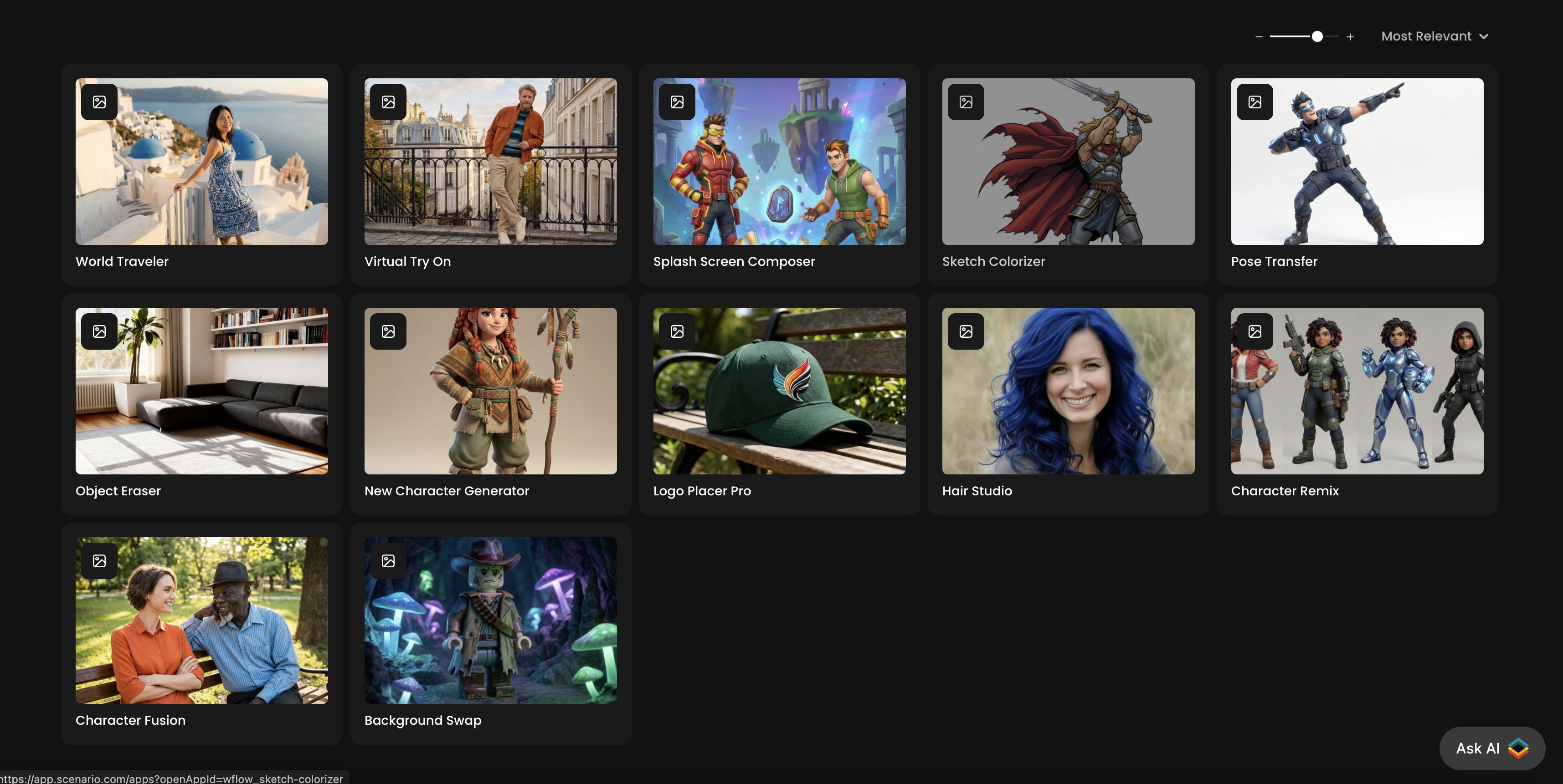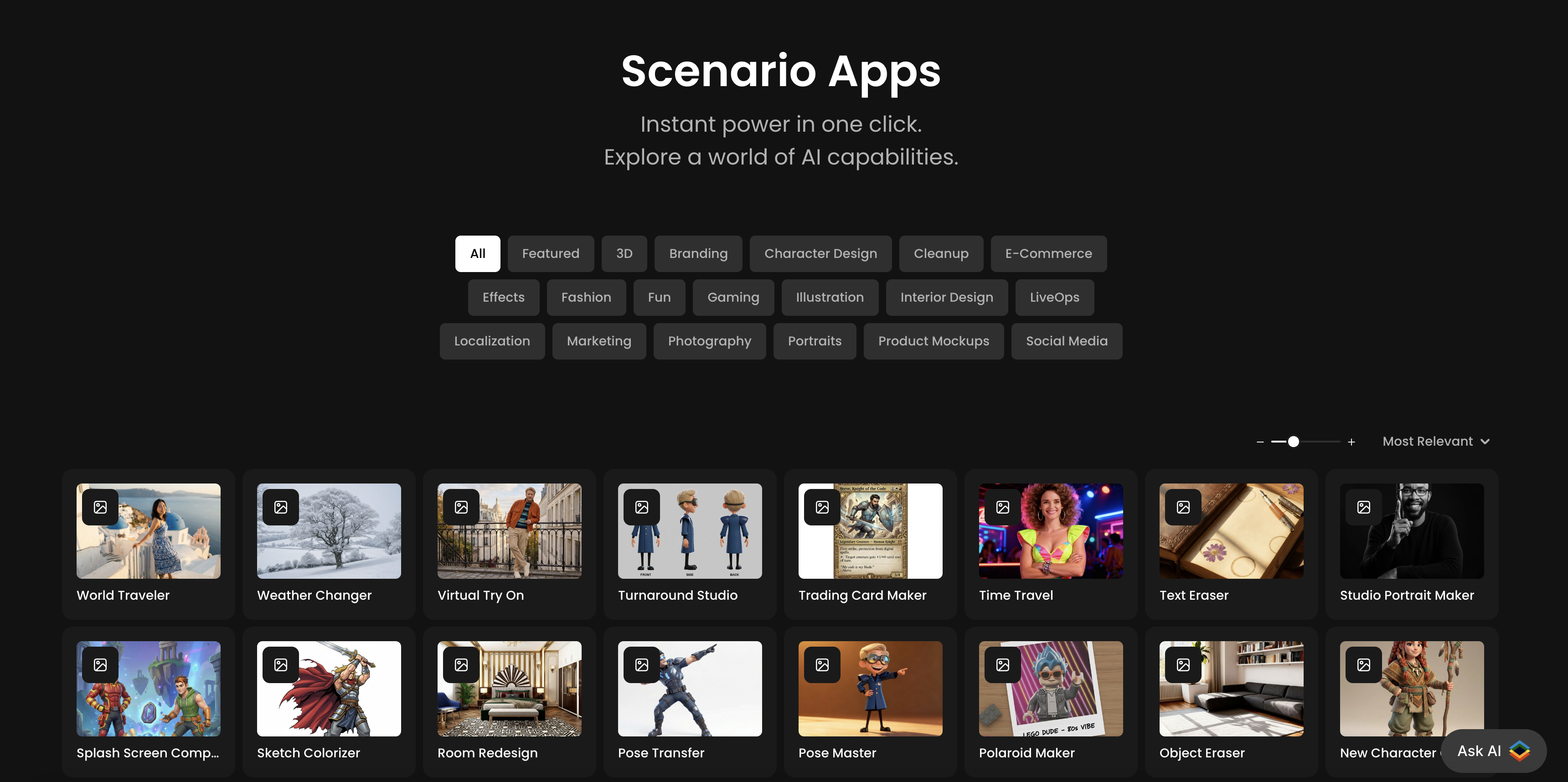 Scenario Apps are pre-configured workflows designed to simplify common creative tasks using AI. They provide a direct way to achieve specific outcomes, such as changing a background or creating a character portrait, without requiring users to build a manual workflow from individual components. Each App is a self-contained tool for a defined purpose.