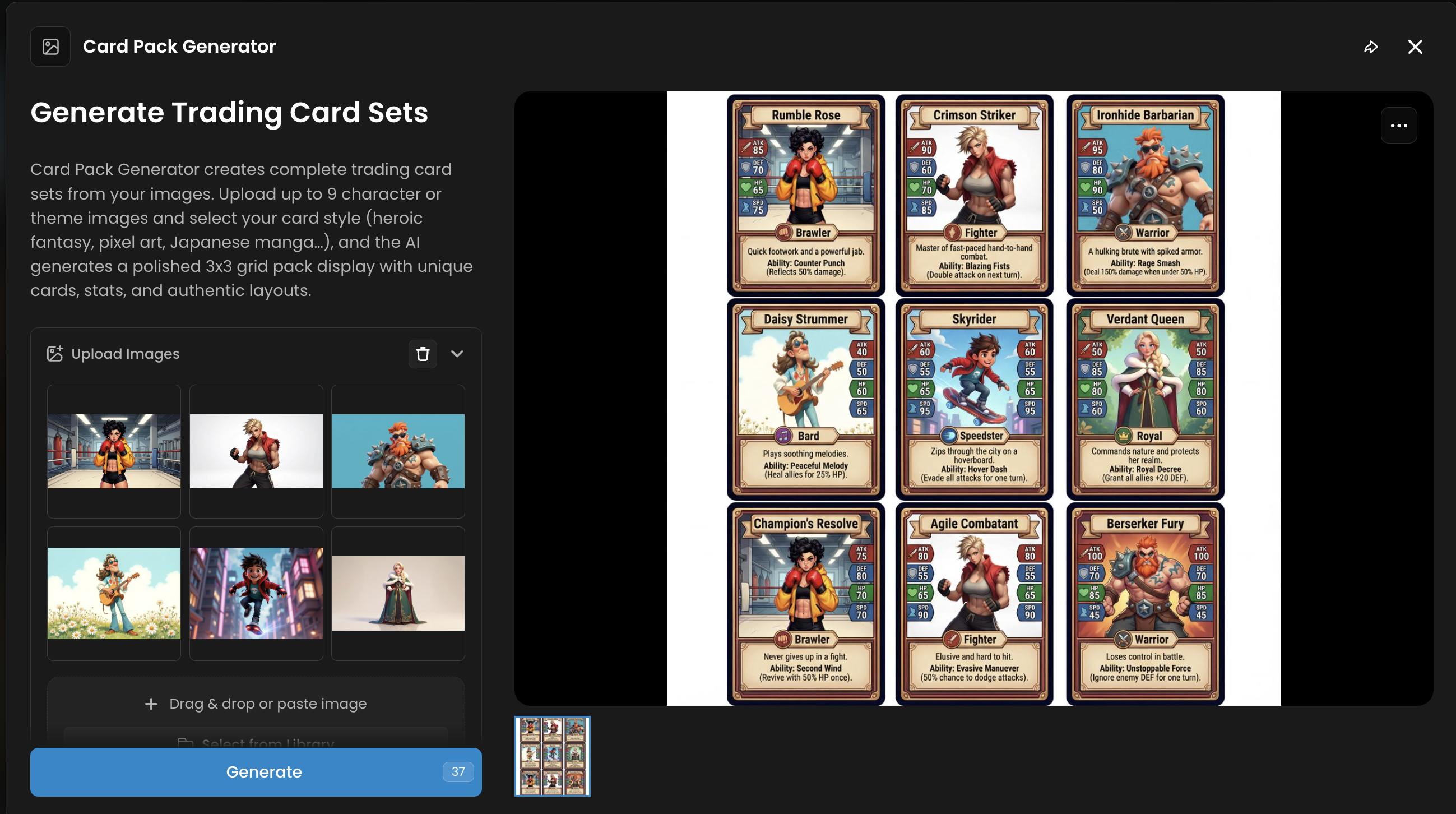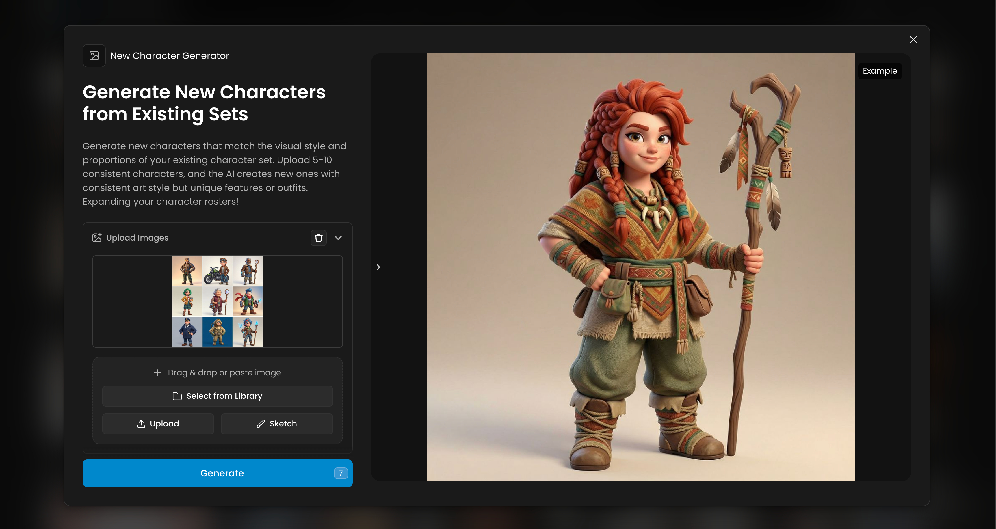 Generate new characters that match the visual style and proportions of your existing character set. Upload 5-10 consistent characters, and the AI creates new ones with consistent art style but unique features or outfits. Expanding your character rosters!
