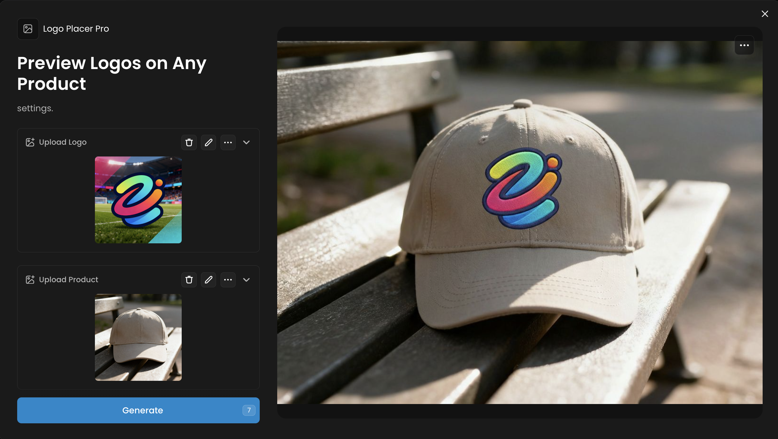 Logo Placer put your logo onto products while matching perspective, lighting, and materials. It adapts to surfaces for a realistic preview, and automatically places your products in the most relevant realistic settings.