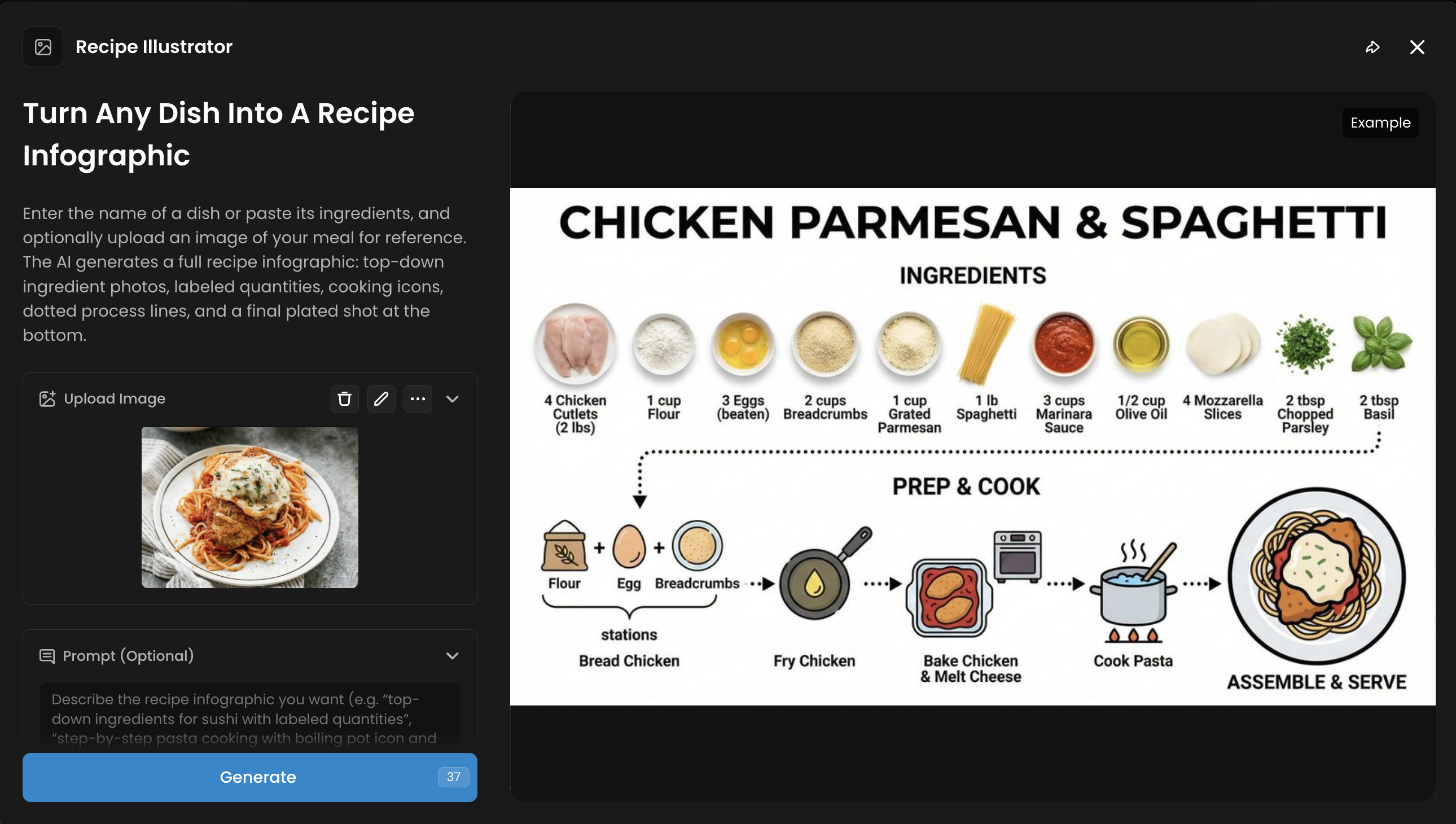 Enter the name of a dish or paste its ingredients, and optionally upload an image of your meal. The App generates a full recipe layout: top-down ingredient photos, labeled quantities, cooking icons, dotted process lines, and a final plated shot at the bottom.