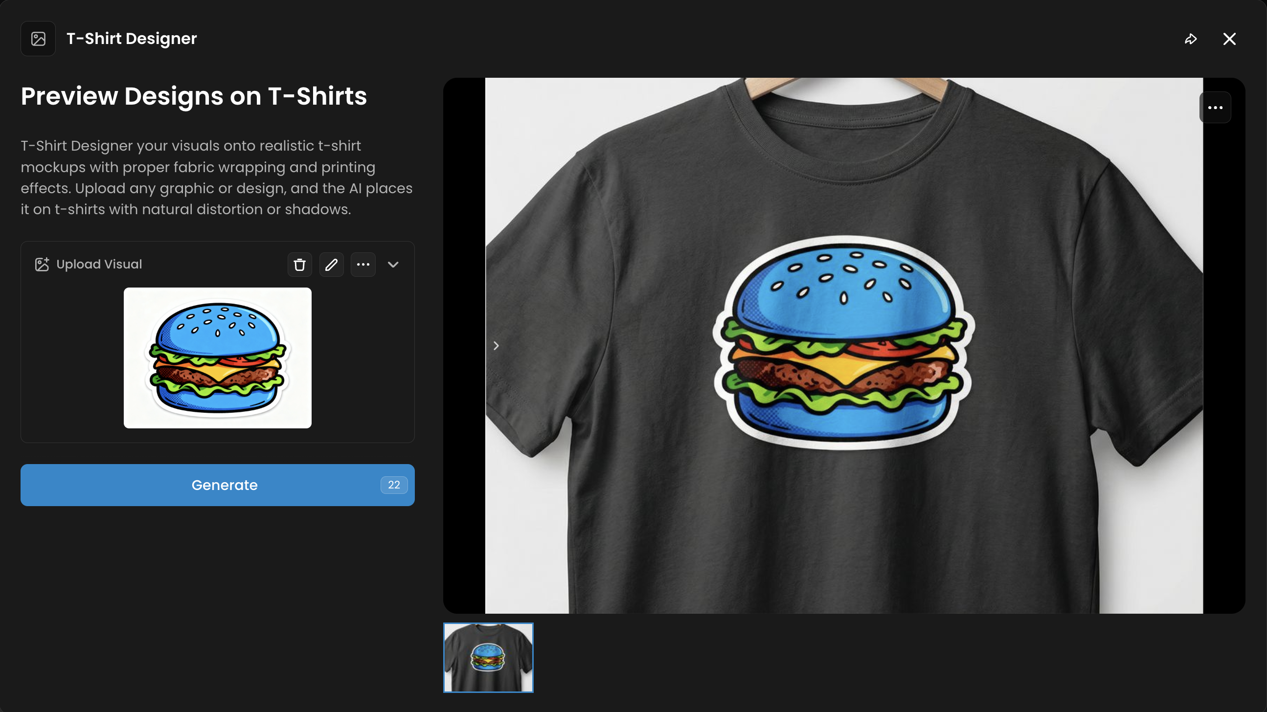 T-Shirt Designer previews artwork on realistic t-shirt models. It allows clothing brands to see how a graphic or logo will appear on a final product before production.