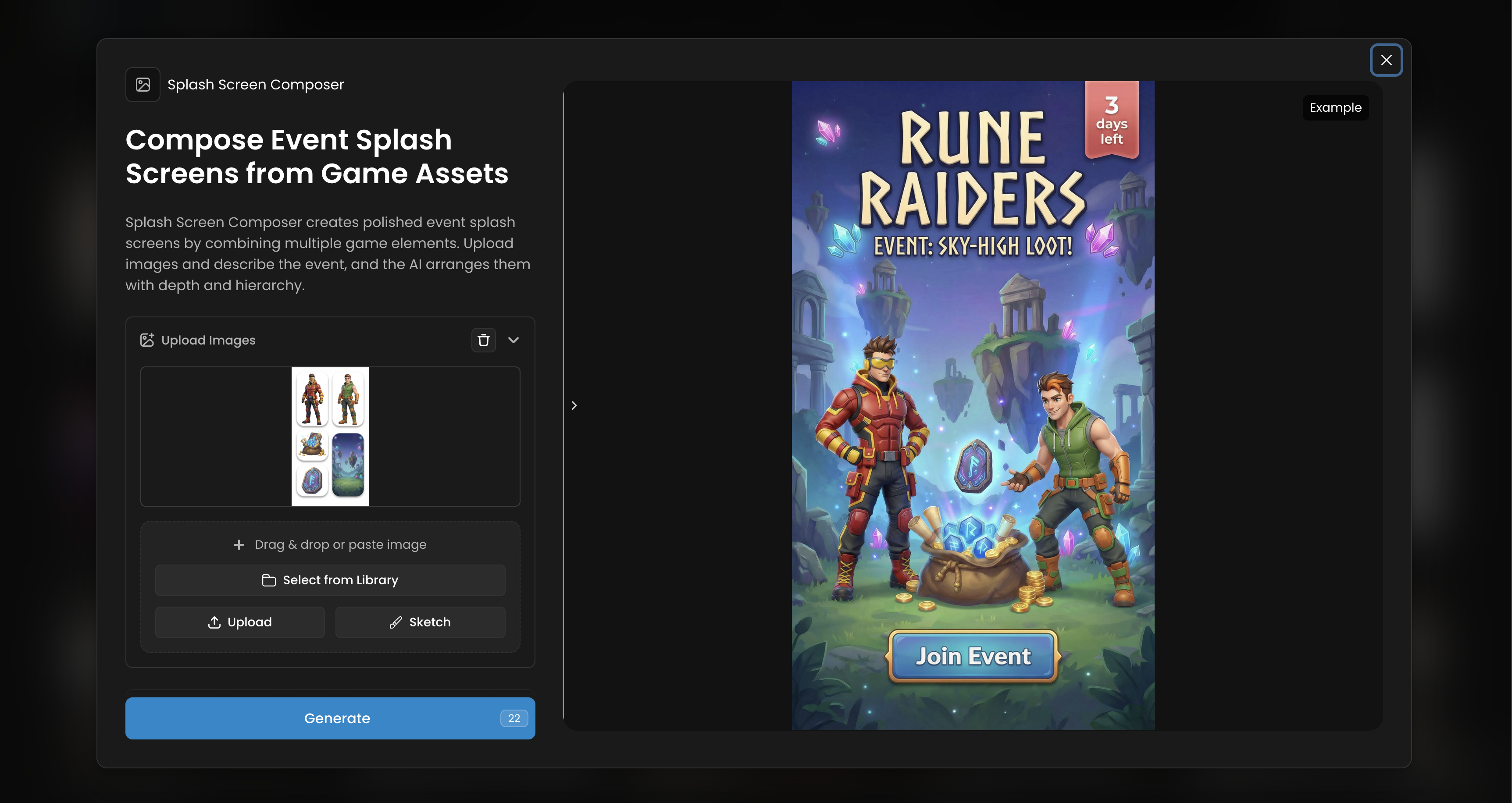 Splash Screen Composer creates polished event splash screens by combining multiple game elements. Upload images and describe the event, and the AI arranges them with depth and hierarchy.