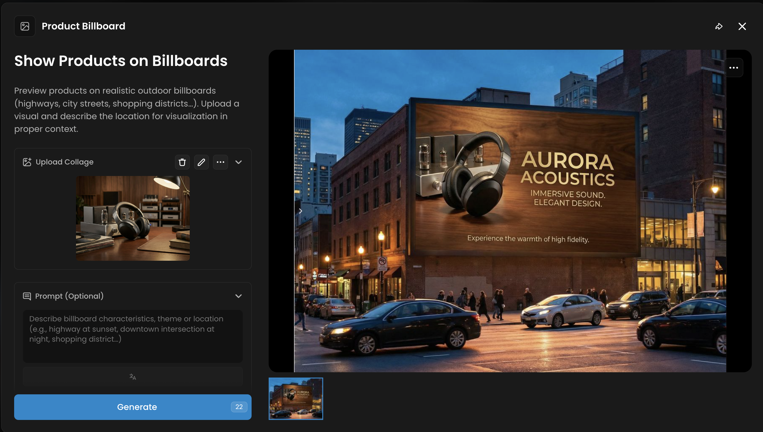 Product Billboard places products on outdoor billboards in urban or rural scenes. This App is designed for promotional campaigns and gives a sense of scale and placement in real settings.