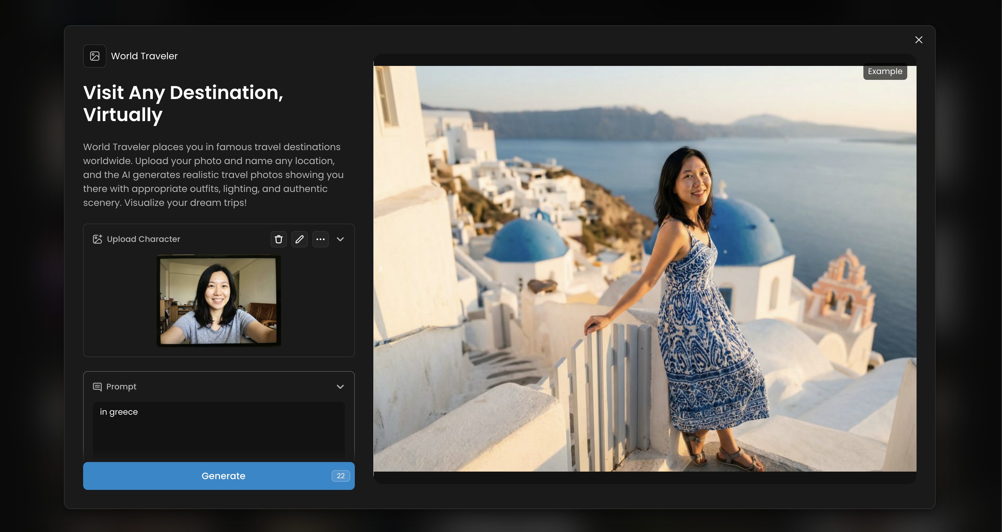 Prompt Field: In many Apps, a text field is available to guide the AI's output. For instance, a user can specify a location in the World Traveler App or a weather condition in the Weather Changer App. This field is often optional.