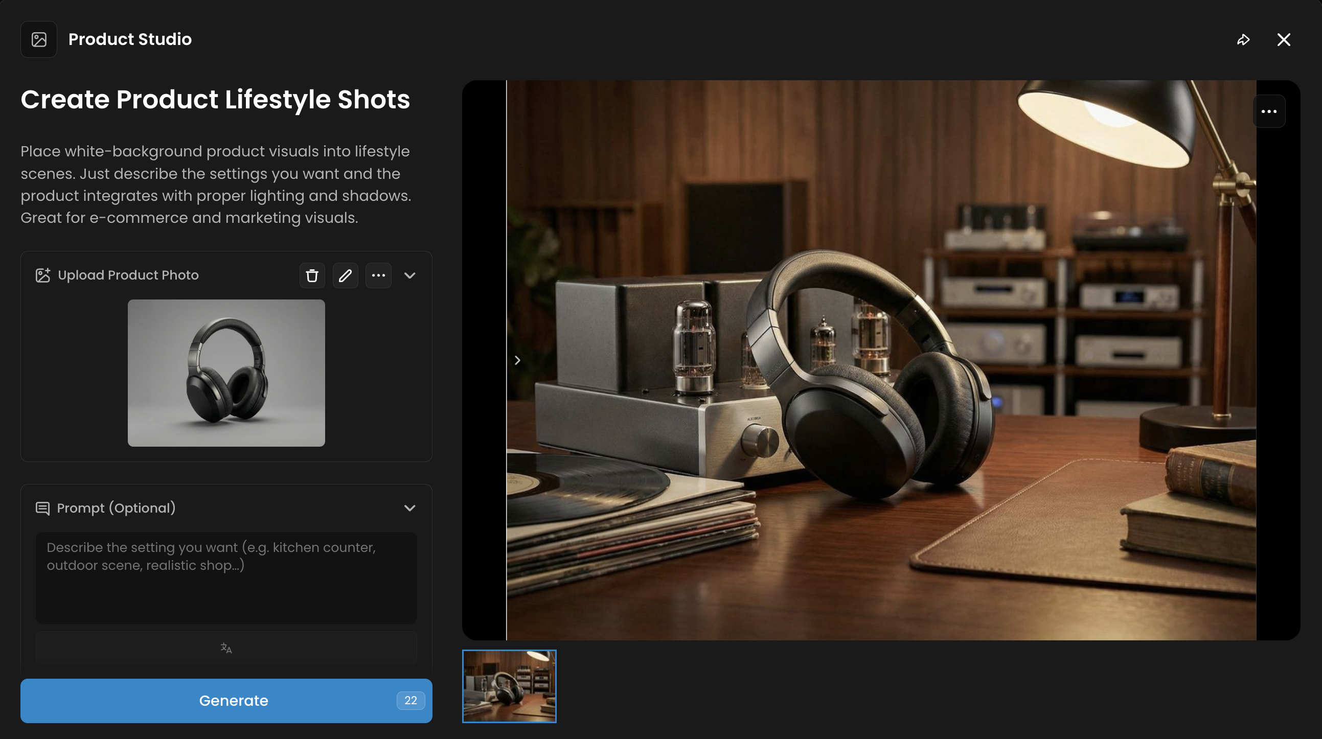Product Studio creates professional product photos using preset lighting, framing, and backgrounds. It is useful for catalog pages, store listings, and promotional visuals where products need to look consistent and polished.