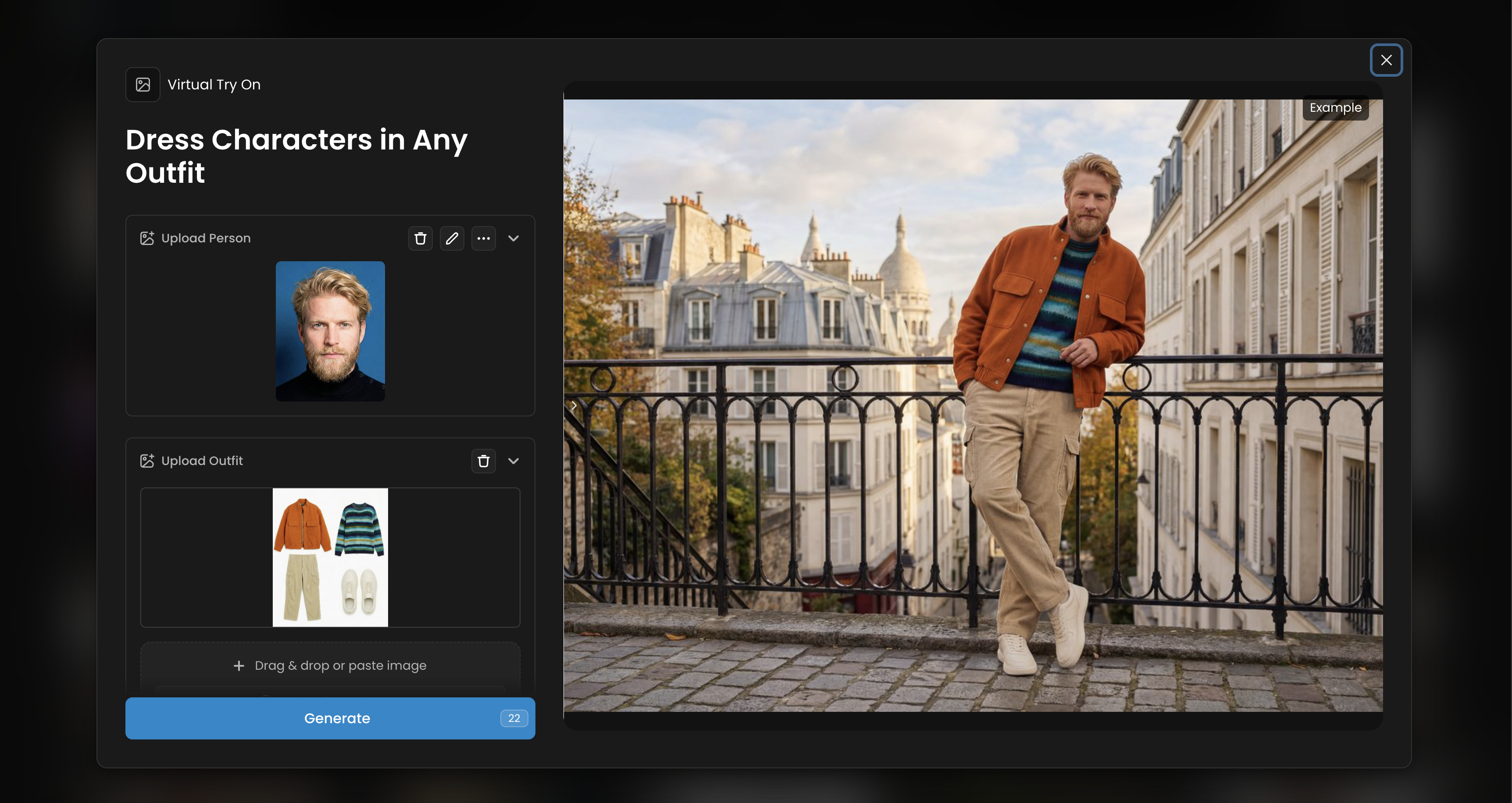 Virtual Try On puts any clothing onto any character. Upload a character photo (portrait or full body) and clothing images, and the AI dresses your character in that outfit with realistic fit and draping, on the same background, on a white background or in a set up that you can define.