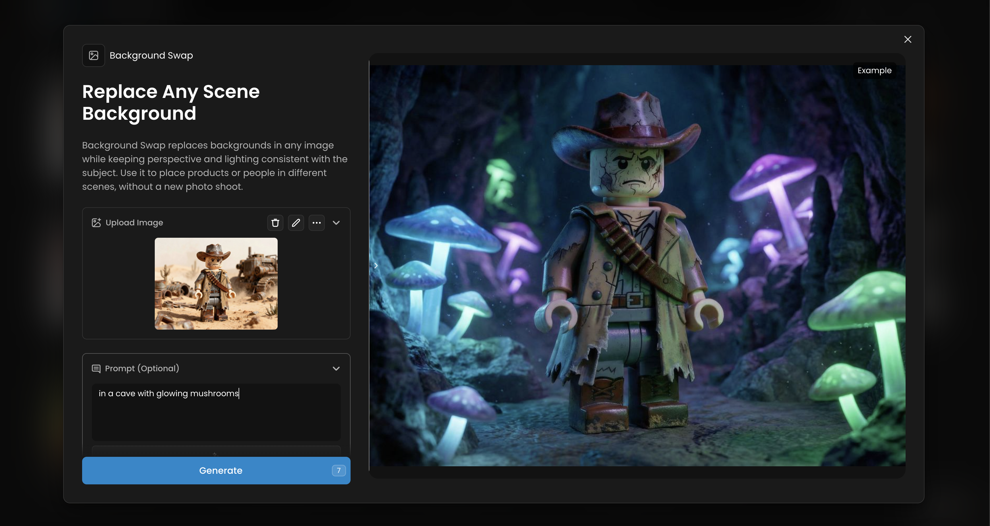 Background Swap replaces backgrounds in any image while keeping perspective and lighting consistent with the subject. Use it to place products or people in different scenes, without a new photo shoot.