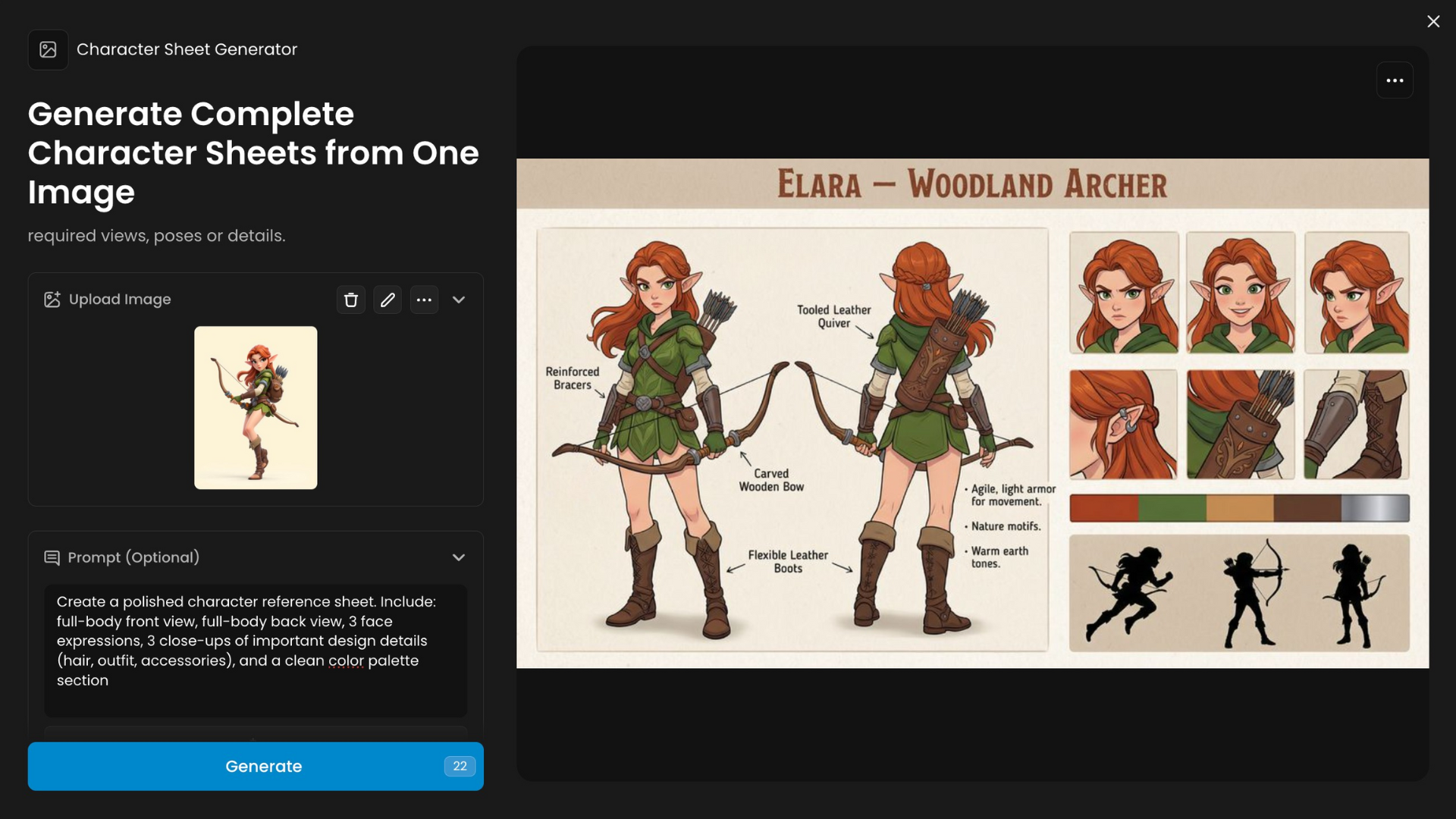Produces character sheets from a single input image. Users can request additional poses, angles, or details to support animation or game documentation