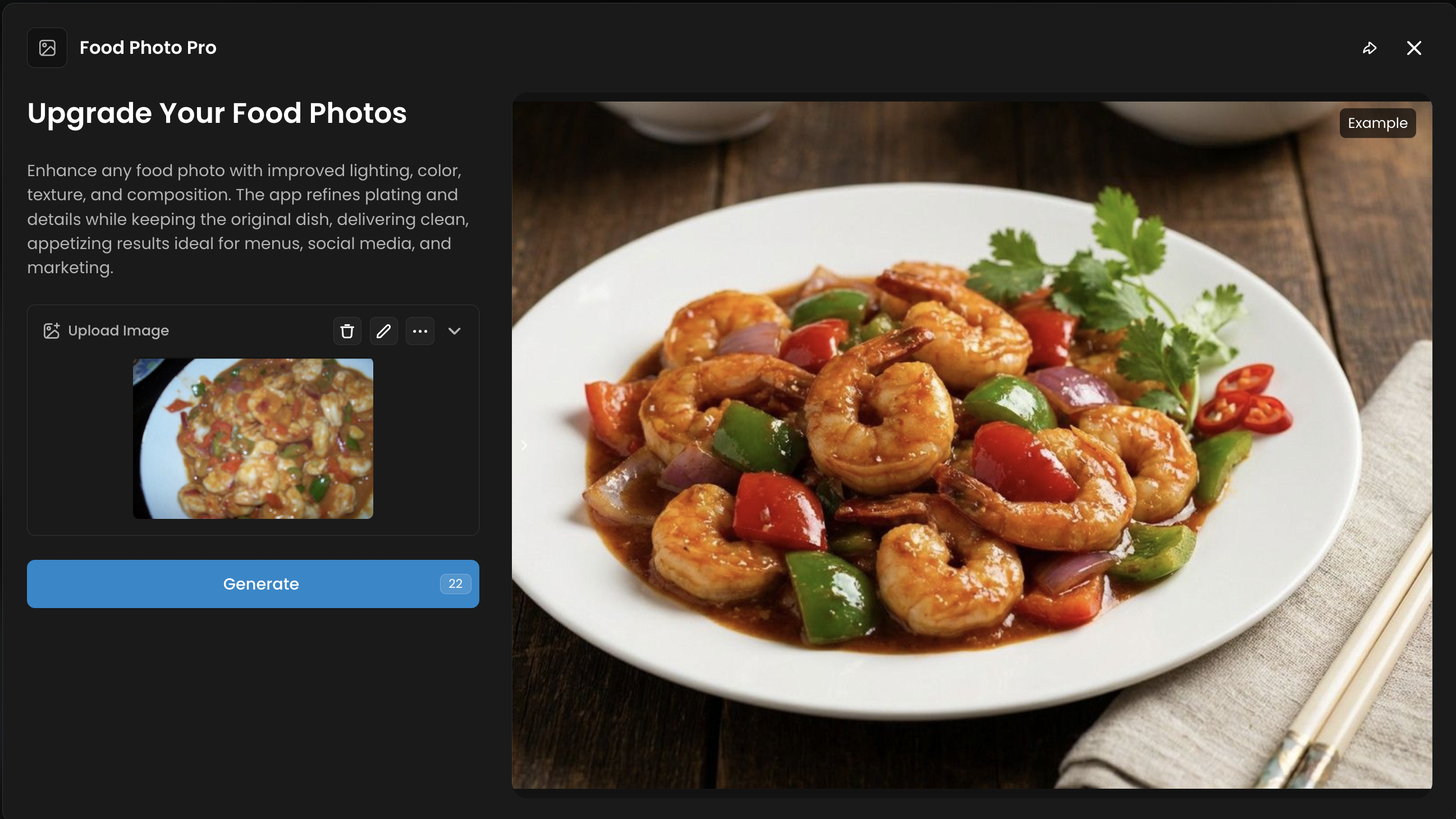 Food Photo Pro enhances food images by improving lighting, sharpness, and presentation. It is suitable for restaurants, food brands, and online stores that require appetizing visuals.
