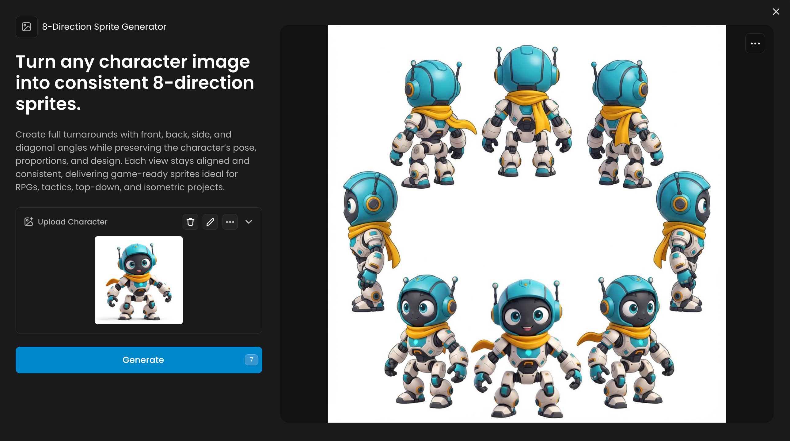 Creates eight aligned views of a character for use in top-down, isometric, or tactics games. The pose, proportions, and design stay consistent across all directions.