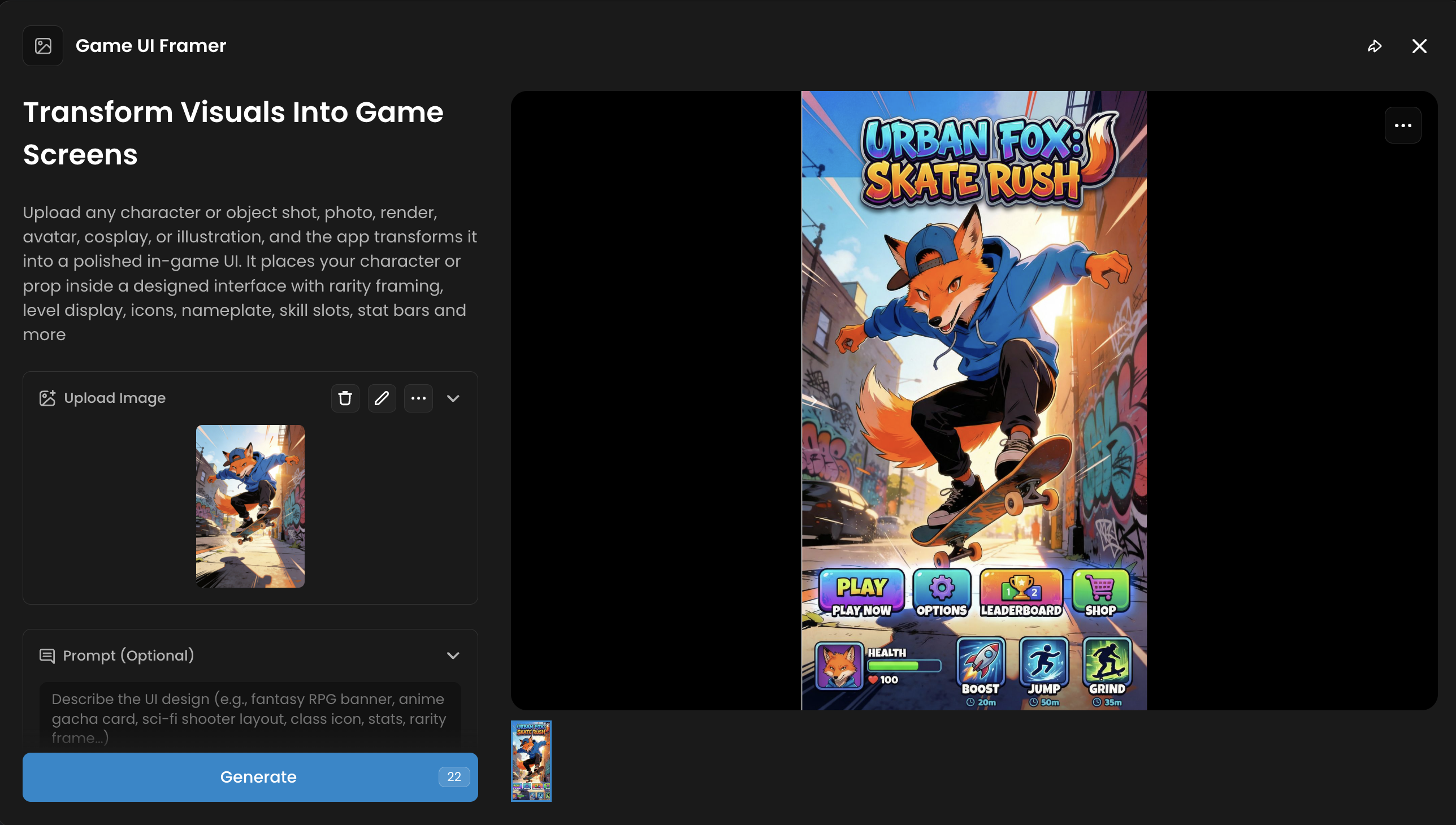 Generate Button: After uploading one or more image(s) and, if desired, entering a prompt, the "Generate" button initiates the generation. The App runs a pre-set sequence of operations in the background and presents the final image in a preview pane.