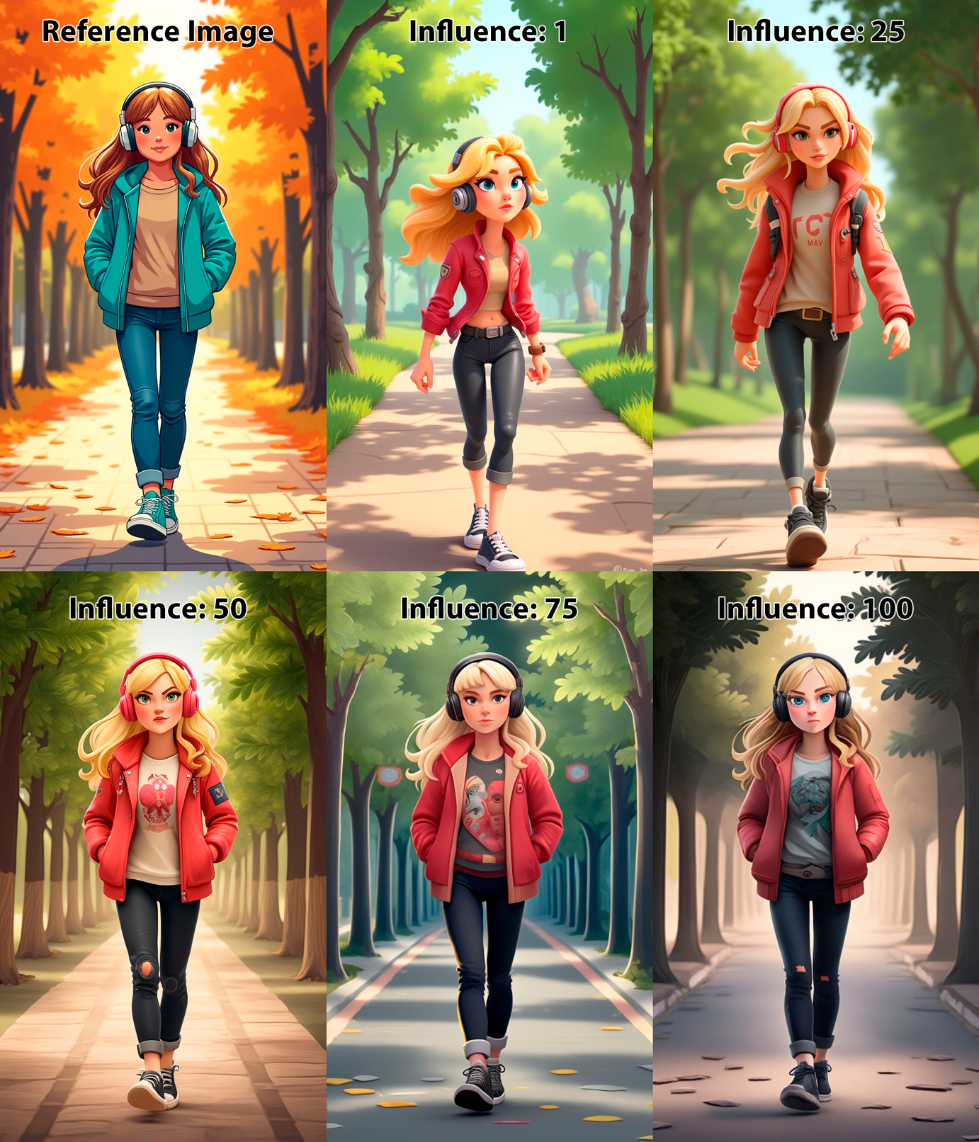 Below is a comparison of images generated with different types of Influence values. Note that low values are very different from the reference and very high values even generate distortions in some cases.