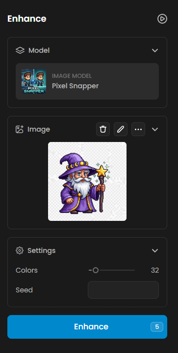 Prepare your input: Upload a PNG or JPG image up to the size limit. For best results, start with art that already has reasonably defined pixels, very blurry or continuous‑tone images may not benefit from snapping.
