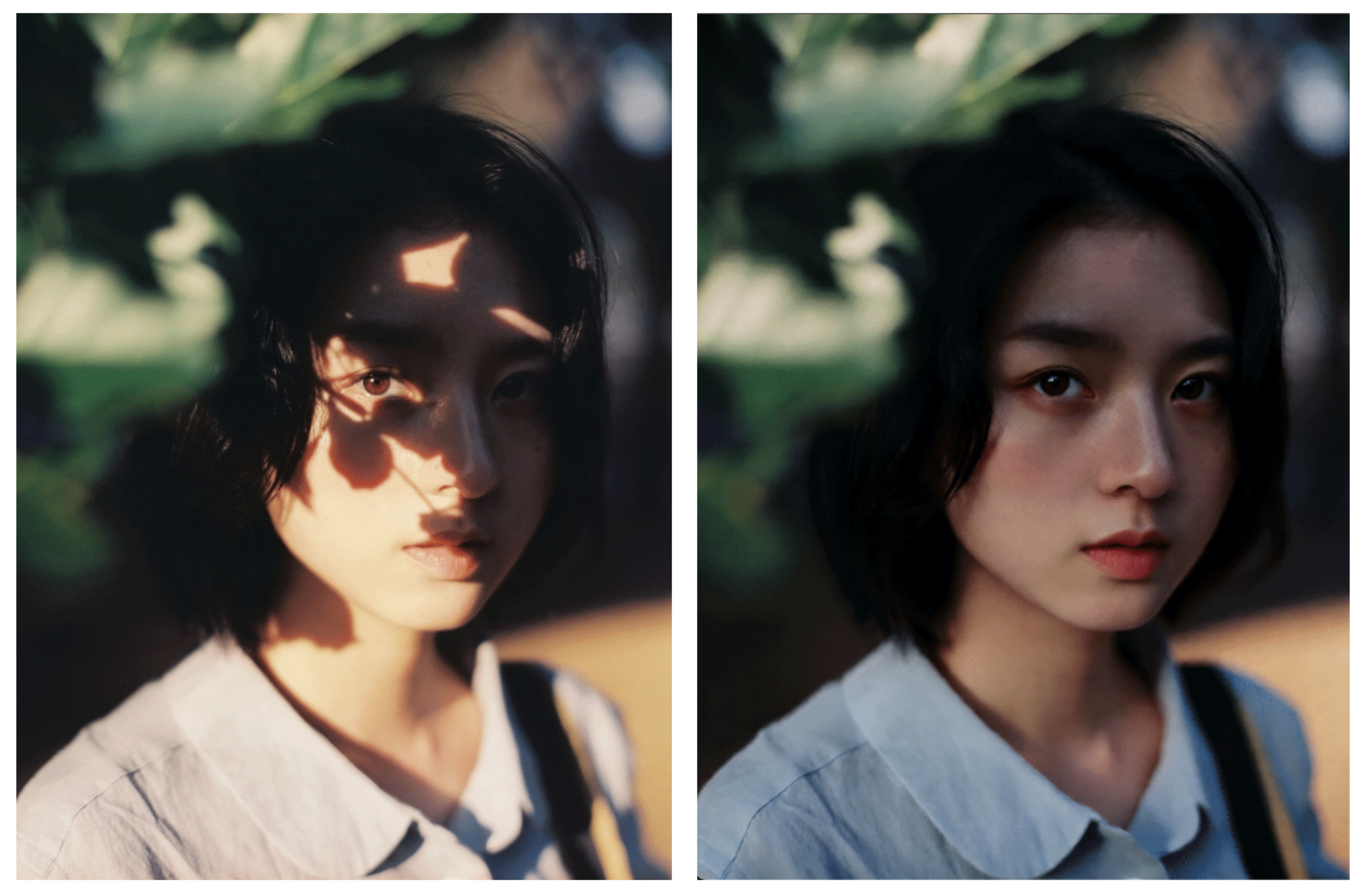 Example: The LoRA removes strong shadow and adds gentle lighting.