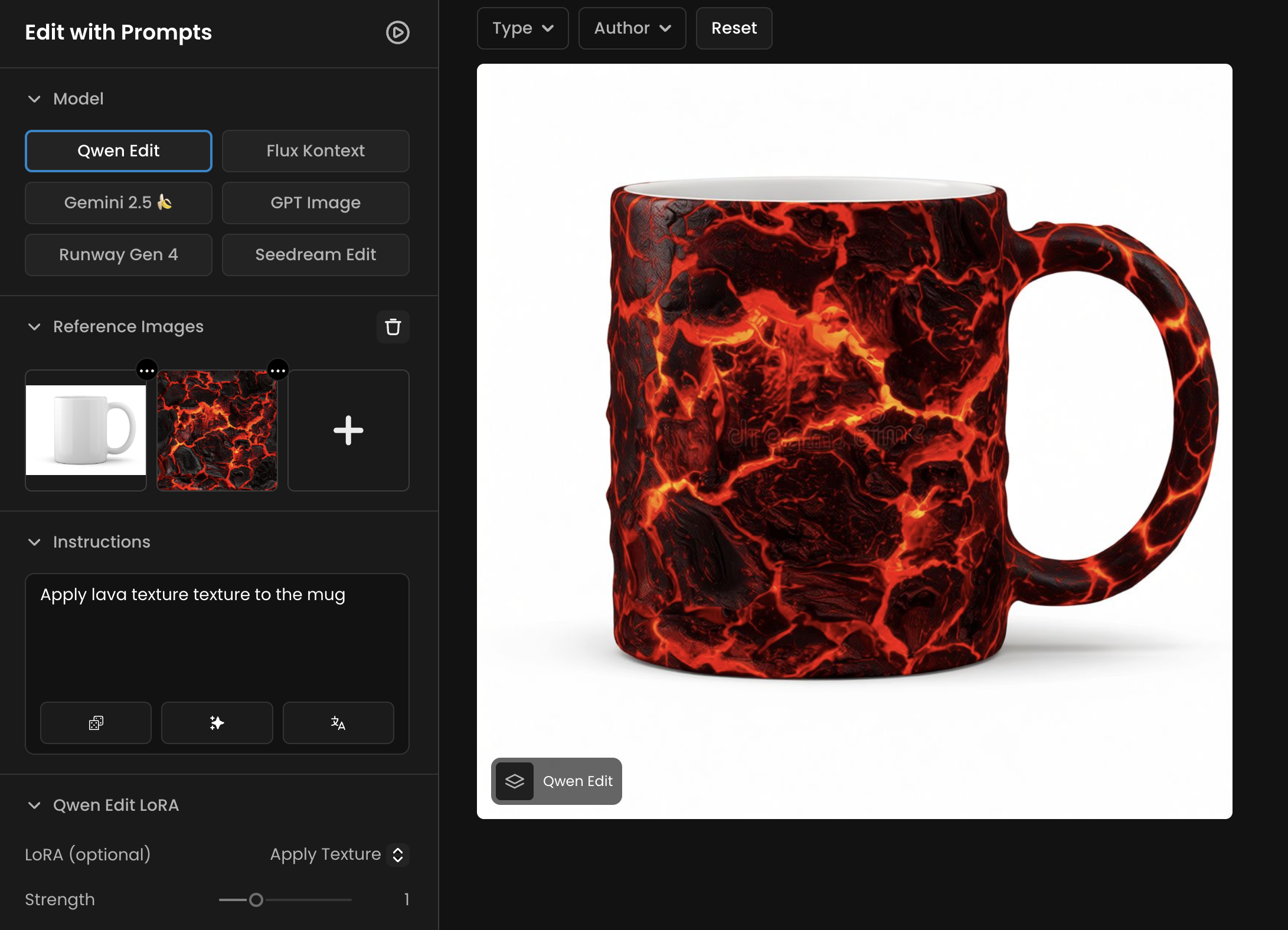 An example of the Apply Texture Qwen Edit LoRA: “Apply lava texture to the mug