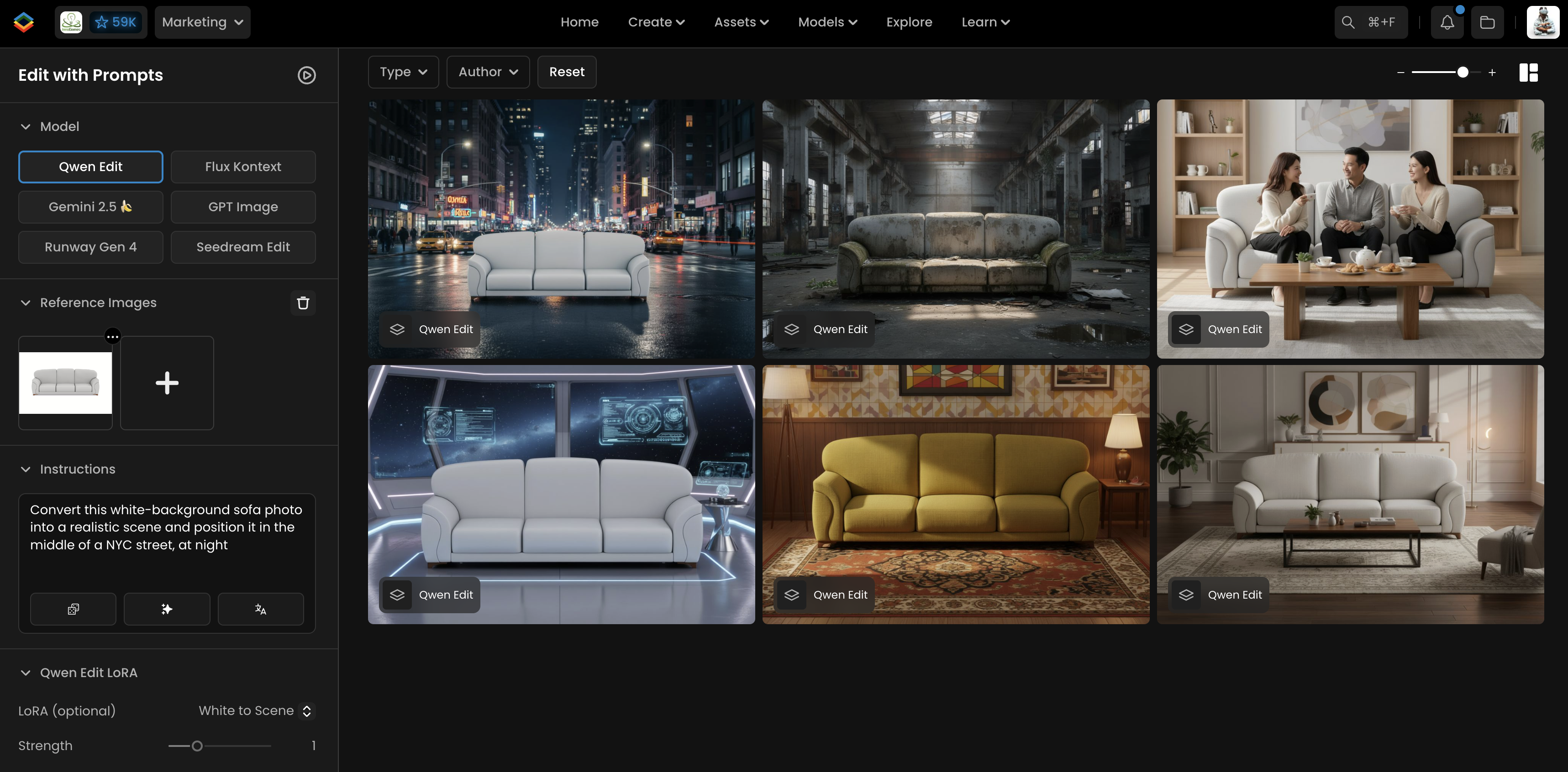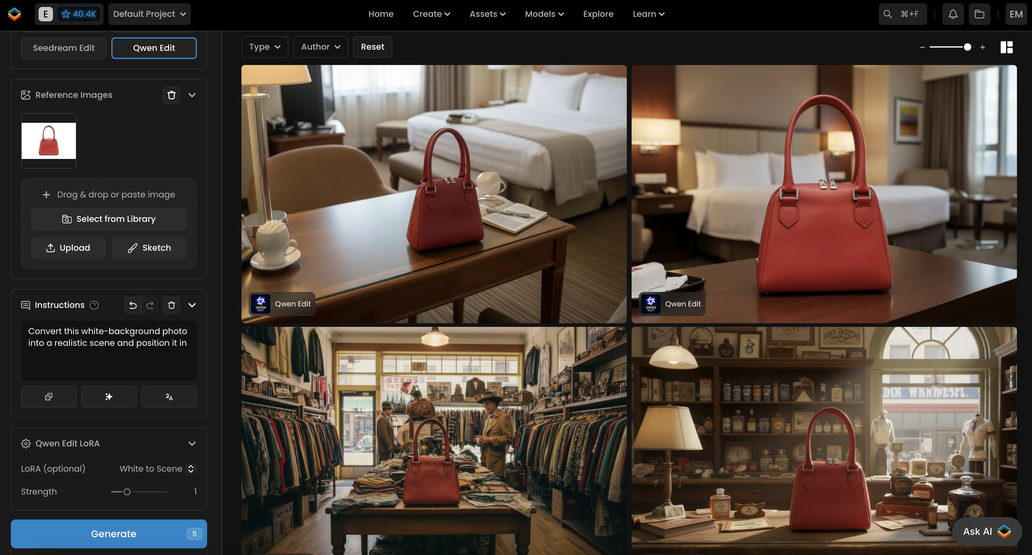 By layering specialized LoRA models on top of the Qwen-Image-Edit base model, Scenario enables creators to perform highly targeted editing workflows (such as virtual camera movement, texture application, scene coherence, and product-to-background integration) with significantly greater precision and creative control.