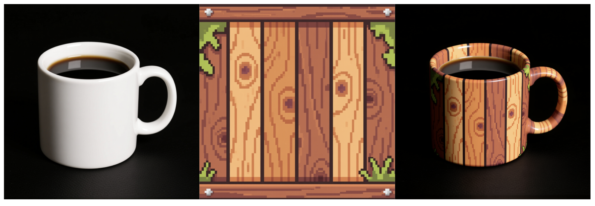 The phrase “Apply … texture to …” is required to activate the LoRA. The model can also apply recursive textures, such as applying a texture of “a woman holding a sign” directly onto a sign surface.