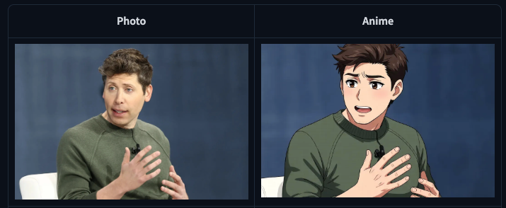 Because this LoRA applies a strong anime stylization—especially to faces—it works best with clear, well-lit headshots and simple backgrounds. The Hugging Face model card provides several before-and-after samples showing how photos are transformed into anime illustrations.
