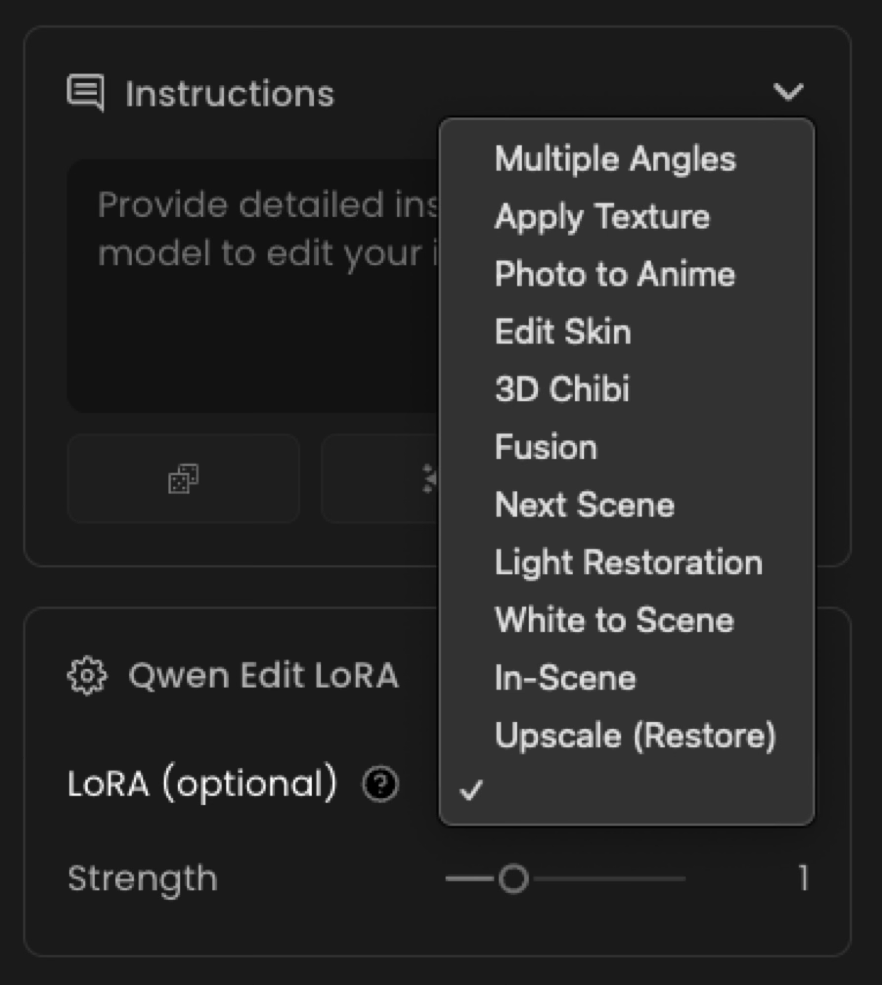 This guide introduces a suite of custom LoRA models specifically designed to work with Qwen Edit, inside Scenario’s “Edit With Prompts“ interface. Each LoRA includes a description of its primary purpose, guidance on how to prompt it, and a link to its corresponding repository on Hugging Face.