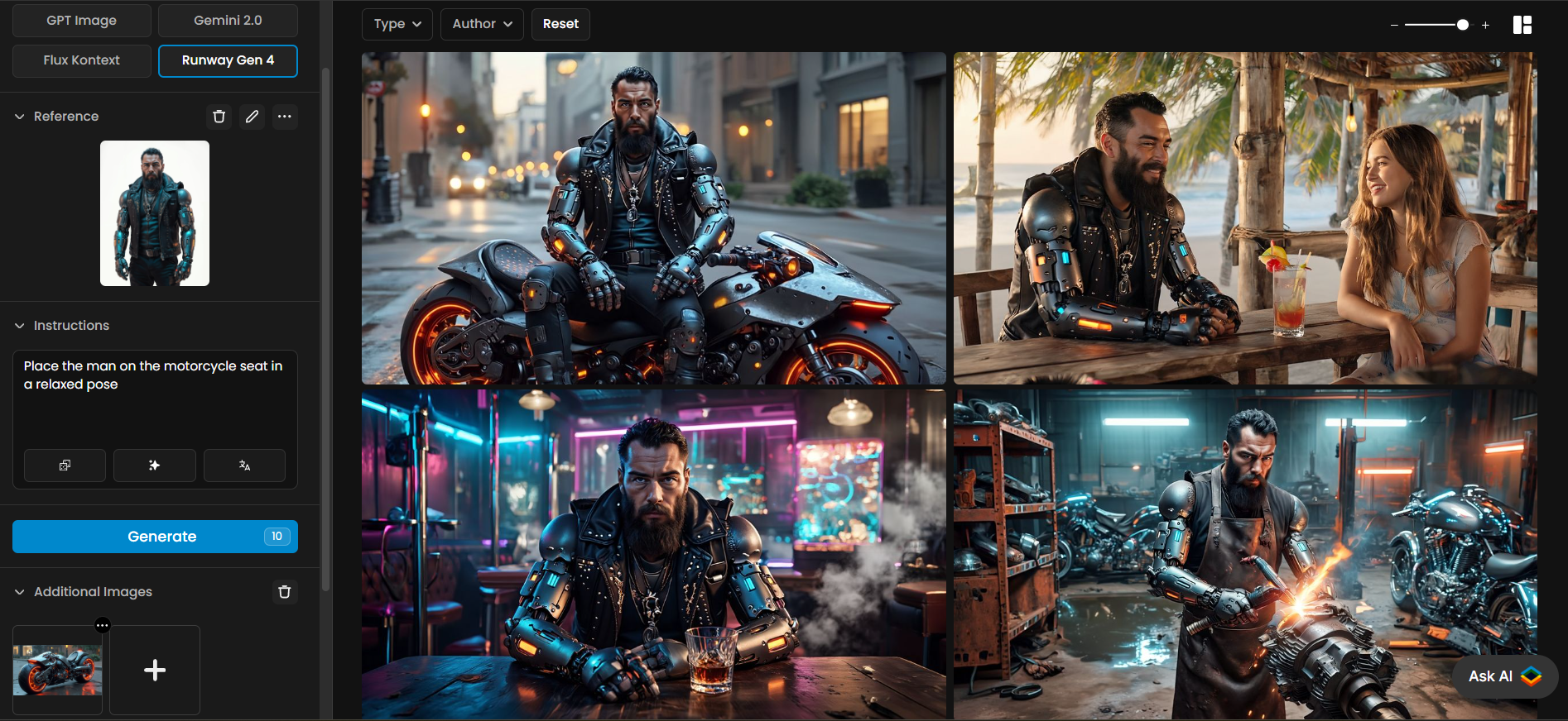 Gen-4 References is especially effective for maintaining consistent visual identity across scenes with the same character. For example, a “cybernetic biker” can appear in various scenarios: seated in a relaxed pose on a futuristic motorcycle in the city, sharing a drink at a beachside bar, sitting confidently in a neon-lit nightclub, or working in a high-tech garage. Throughout each scene, the model preserves the character’s design, details, and proportions, ensuring coherence and recognizability from one environment to the next.