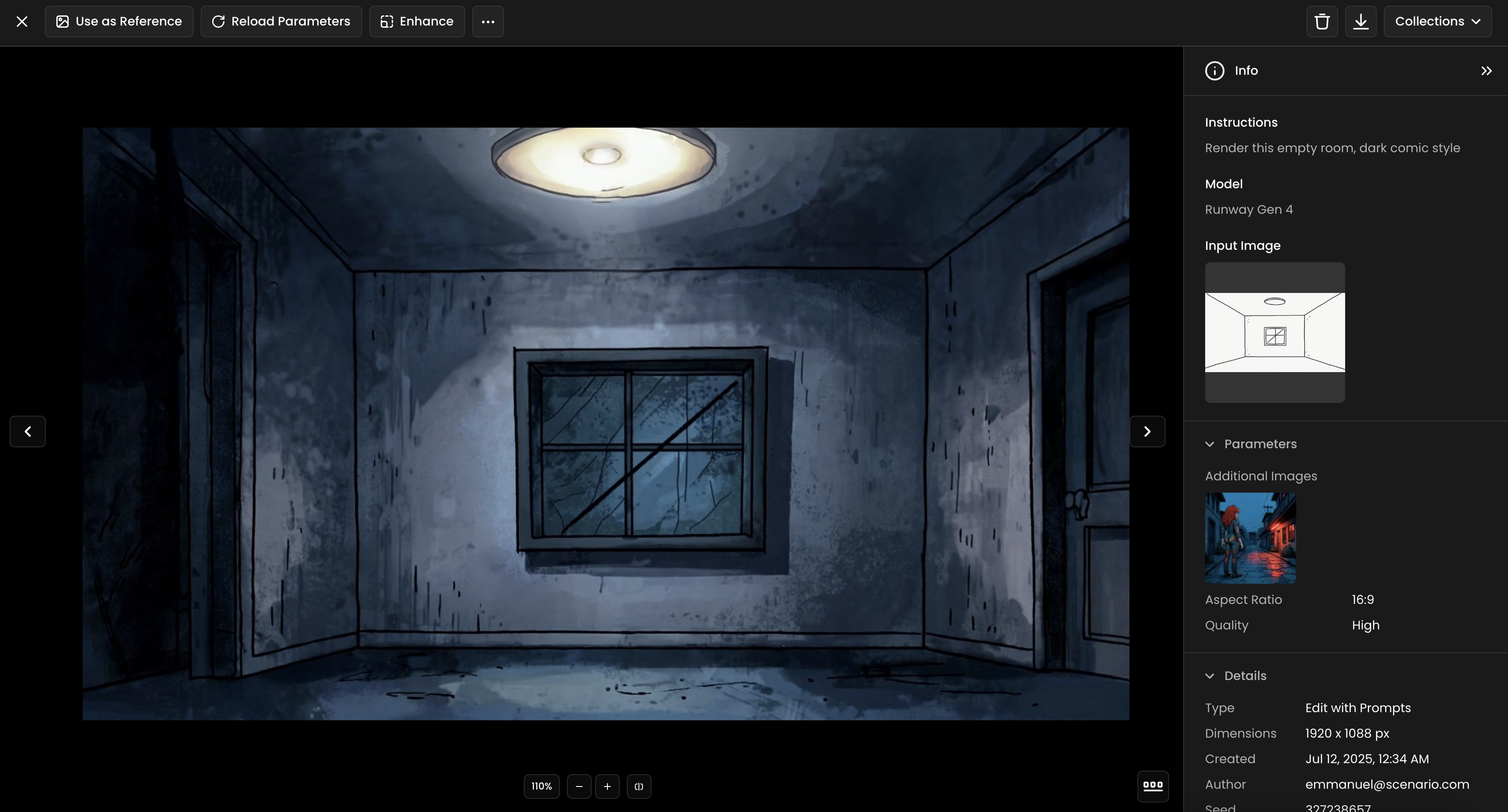 Use a simple sketch as your starting point to generate rendered environments or subjsct. In this example, a basic outline of an empty room was transformed into a fully rendered interior in a dark comic style. Try experimenting with different drawing styles and mood prompts to explore how Gen-4 interprets your ideas.