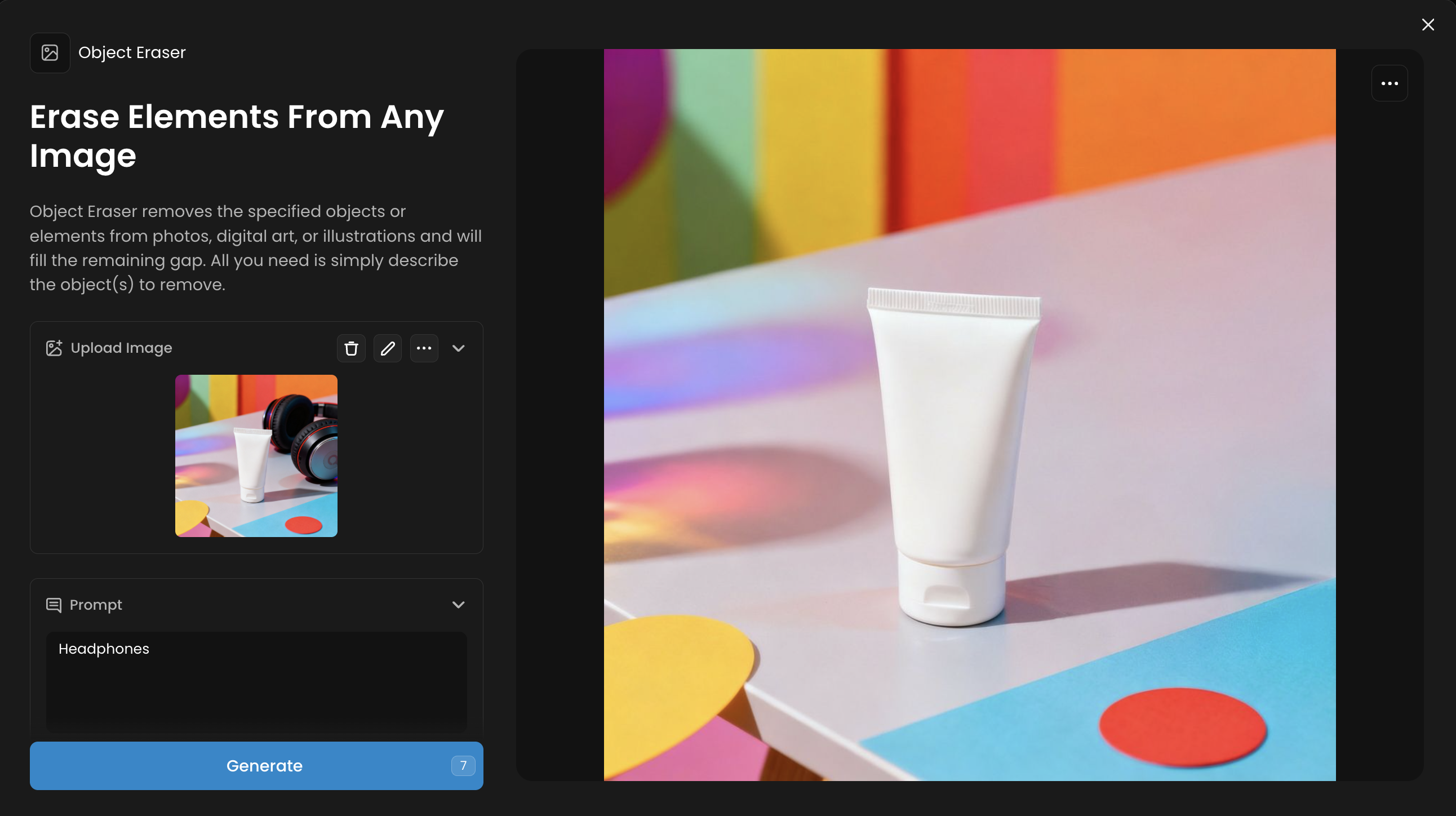 Workflow: Upload a product photo and use a text prompt to describe the object you want to remove (e.g., "remove the price tag," "erase the distracting reflection").