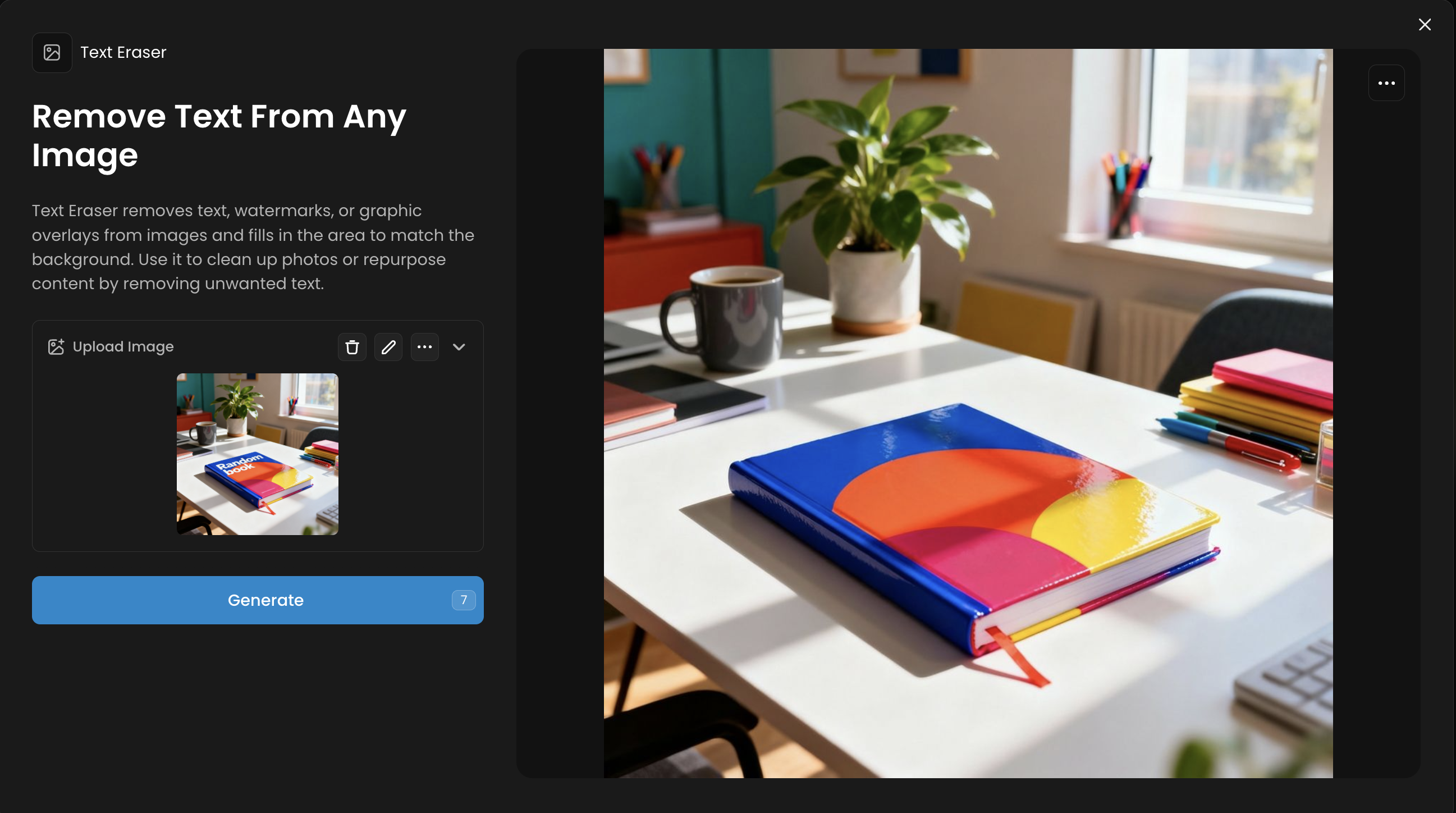 Text Eraser removes text, watermarks, or graphic overlays from images and fills in the area to match the background. Use it to clean up photos or repurpose content by removing unwanted text.