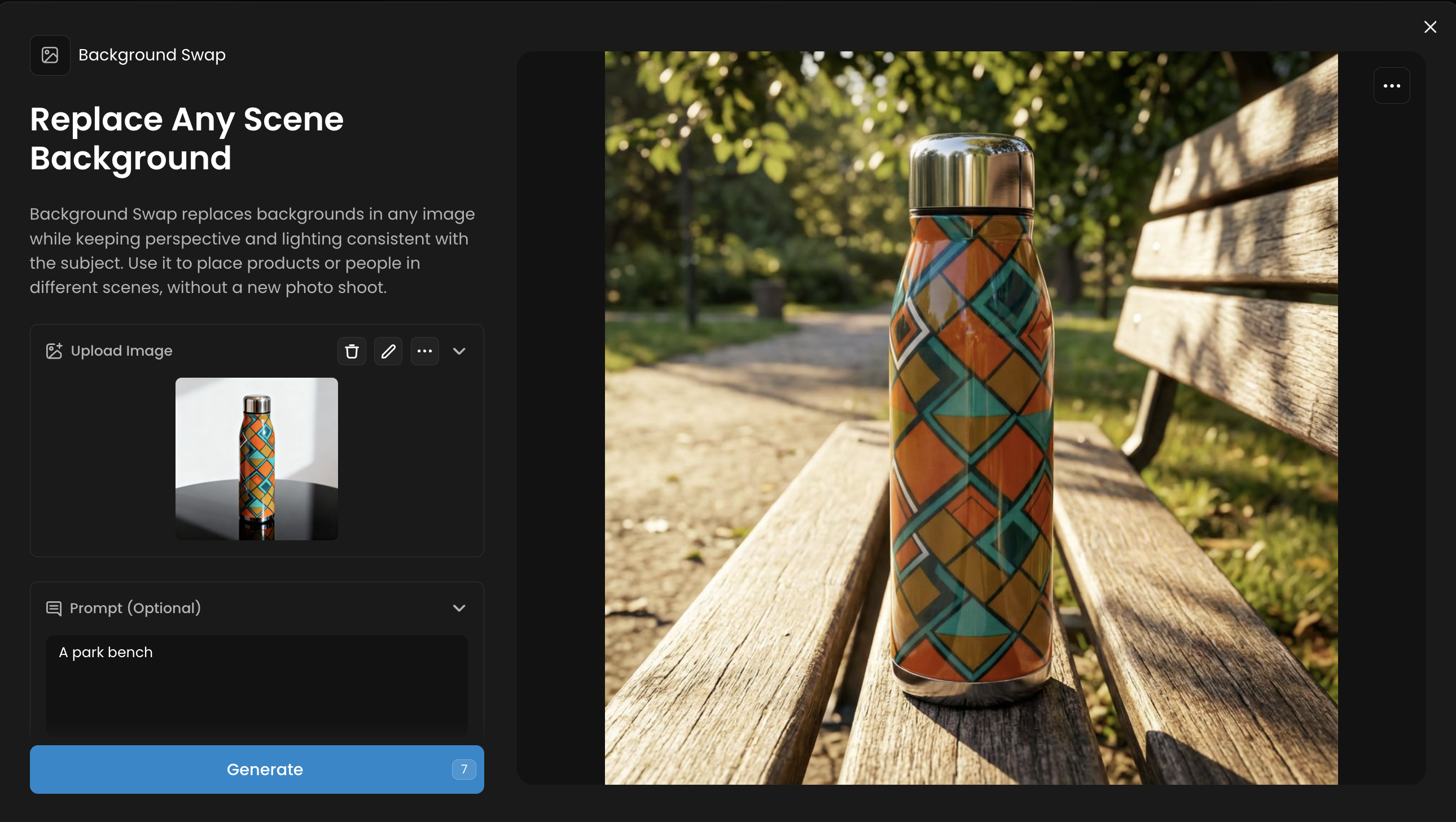 Background Swap replaces backgrounds in any image while keeping perspective and lighting consistent with the subject. Use it to place products or people in different scenes, without a new photo shoot.