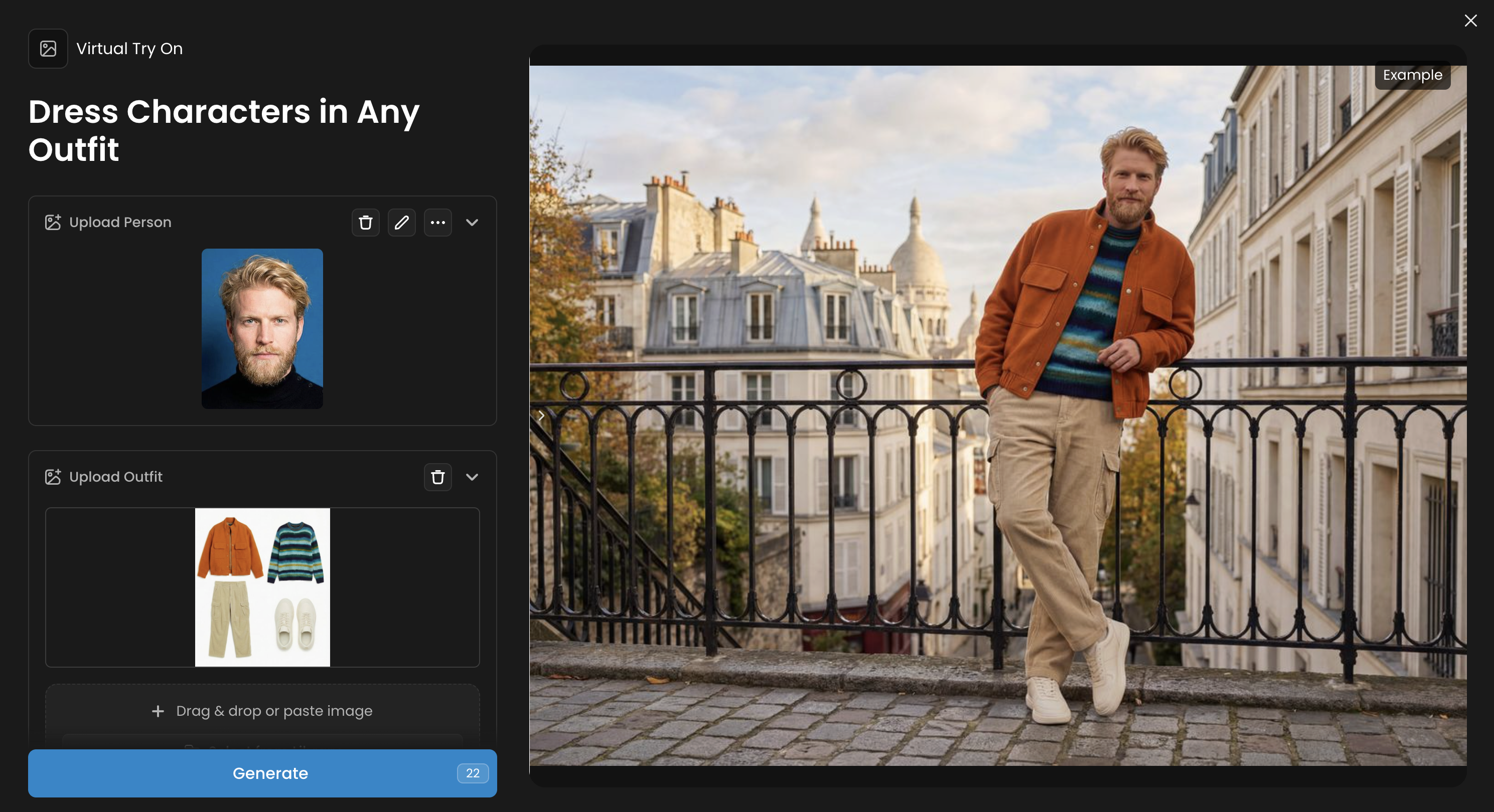 Virtual Try On puts any clothing onto any character. Upload a character photo (portrait or full body) and clothing images, and the AI dresses your character in that outfit with realistic fit and draping, on the same background, on a white background or in a set up that you can define