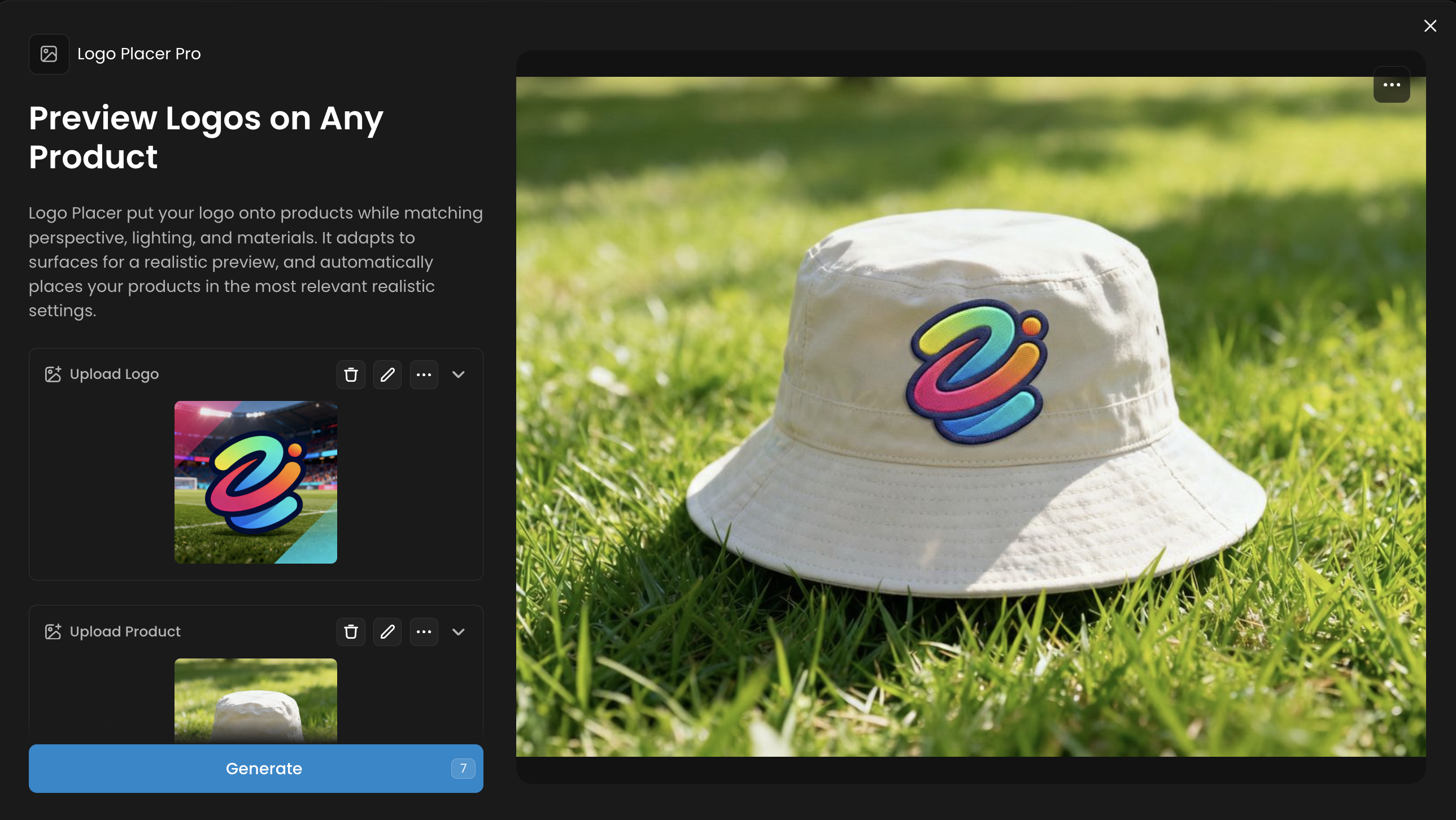 Logo Placer put your logo onto products while matching perspective, lighting, and materials. It adapts to surfaces for a realistic preview, and automatically places your products in the most relevant realistic settings.