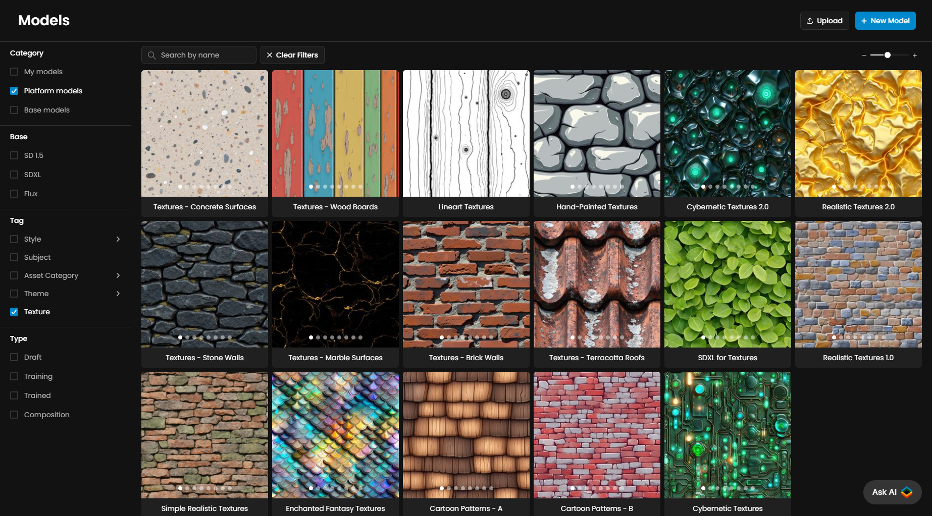 Custom Models: For a truly unique style, you can train your own texture model by uploading 10-50 images that reflect your desired look. Tag it with "Texture" after training to use it in the Generate Textures screen.